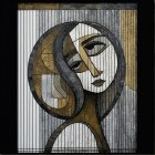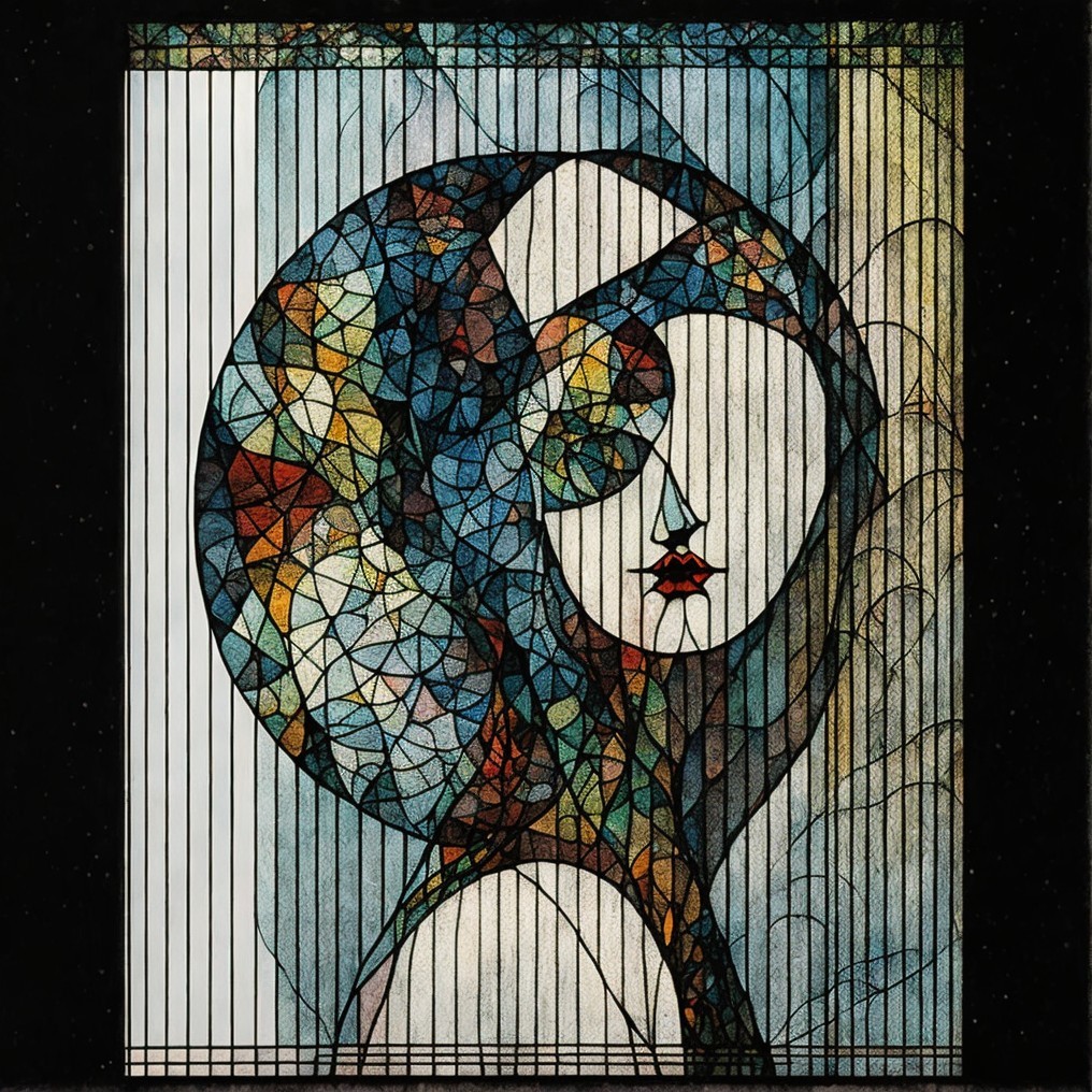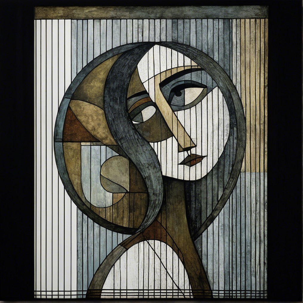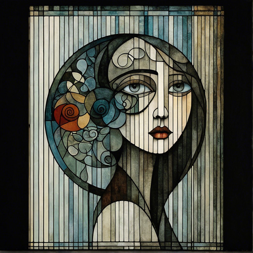 The image features a stylized portrait of a woman with a geometric design, blending muted colors and bold lines, evoking a sense of introspection and modern artistic expression.