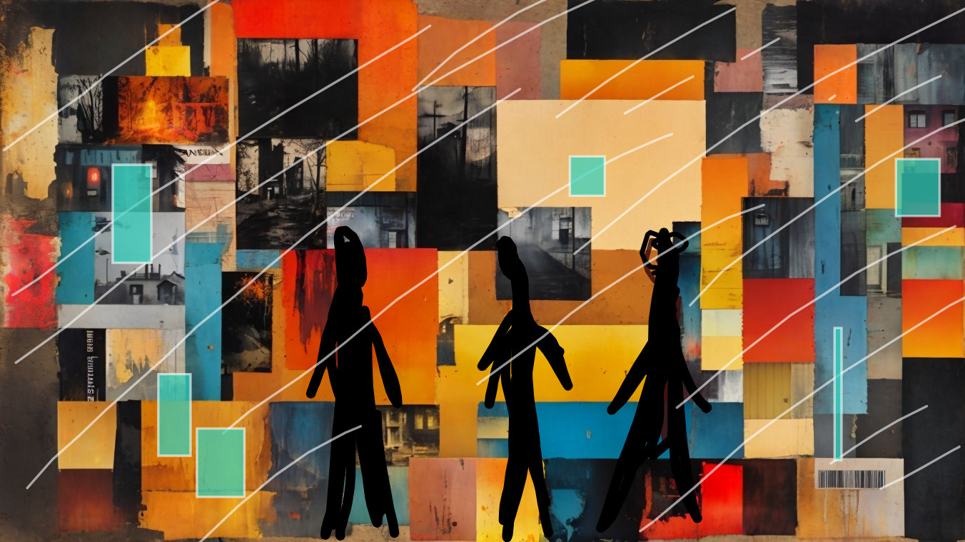 A vibrant collage featuring silhouettes of figures walking amidst bold, colorful geometric shapes. Faces and abstract elements create a sense of mystery and intrigue in the composition.