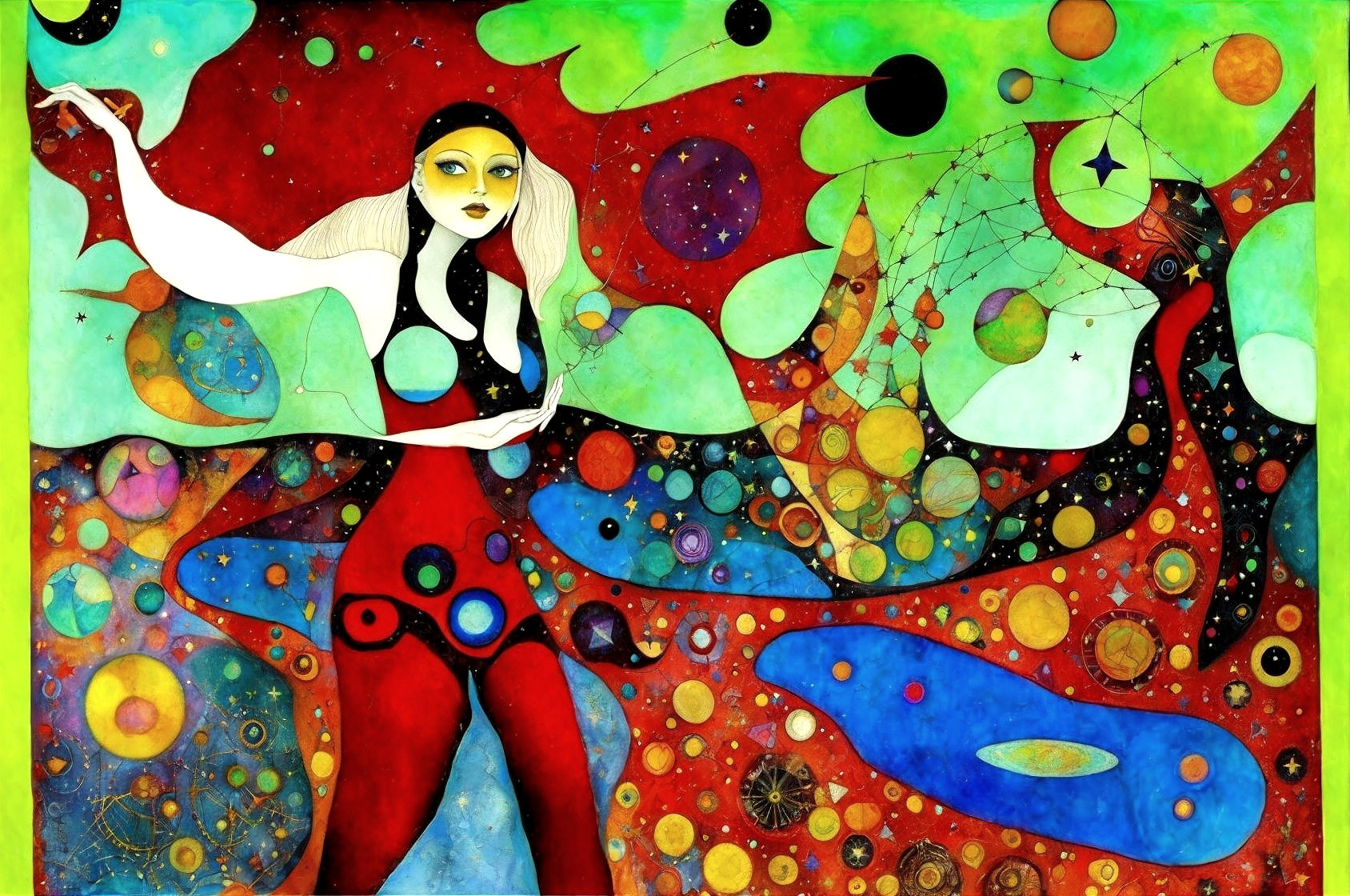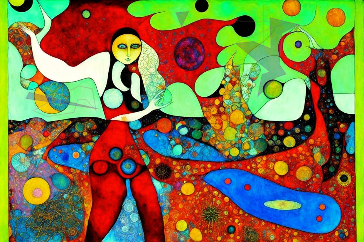 A vibrant, colorful abstract painting featuring a whimsical figure surrounded by cosmic motifs and patterns. Yes this ai generated description was very good actually. I would also add that there are NO perversions on display maybe.
