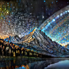 A breathtaking night scene showcases majestic mountains under a starlit sky, with a vibrant Milky Way arching above. Reflections shimmer on a serene lake, highlighted by autumn-colored trees.