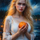 A whimsical witch in a red dress holds a carved pumpkin against a moonlit backdrop. Vibrant autumn leaves swirl around, featuring pumpkins on the ground and a distant haunted house.