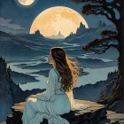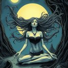 Woman with Long flying black Hair, sitting in Meditation, moonlight, Style: Möbius, Daniel Merriam, Egon Schiele, Alphonse Mucha, Anna Dittman, illustration