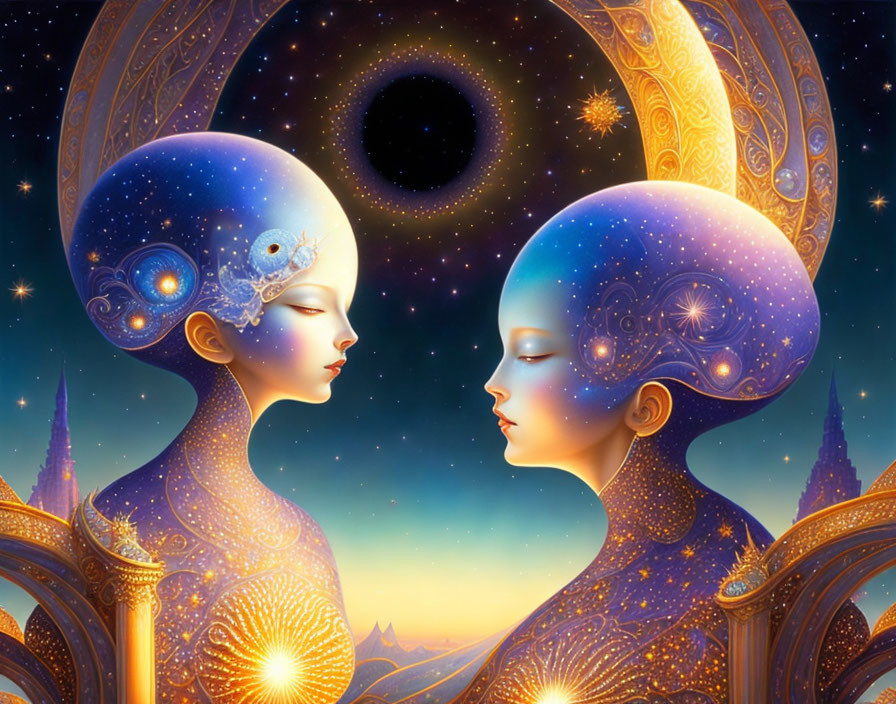 Ethereal figures with celestial bodies in cosmic setting