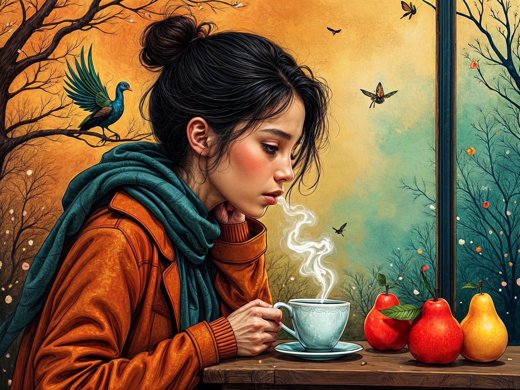 Prompt: "Melancholic young girl, cozy café setting, vibrant spring colors, steaming coffee cup, ethereal beauty, Neverland landscapes, Yossi Kotler style, Chuck Jones inspiration, Margaret Keene influence, abstract realism, surrealism touch, Russ Mills, Dariusz Zawadzki vibe, Archaeopteryx bird, apples and pears, Zentangle patterns, national ornament motifs, warm golden hues, red ochre, umber tones, fragrant fruit aroma, cross-hatching technique, ornate elements, Browning Marie, El Anatsui, Zentangle art, Gustav Klimt opulence, peacock feather, geometric patterns, exotic seashells, harmonious arrangement.designed by Рома Аріведерчі,GoBi,Aife,Наталья И-ва"