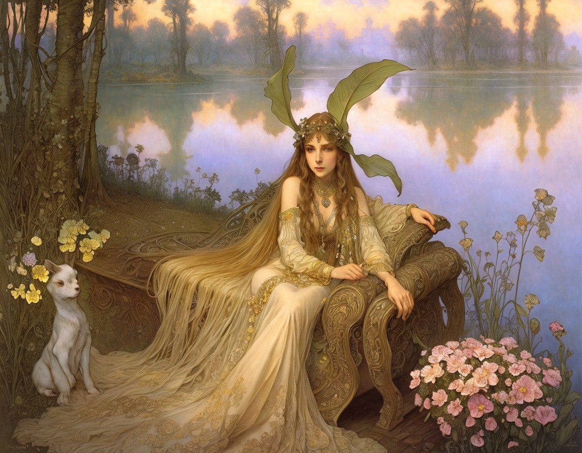 A woman in a flowing gown sits pensively by a balcony overlooking a serene, fantastical cityscape during a twilight hour.