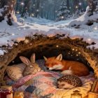 In a snowy, serene setting, three adorable animals—a pair of cozy rabbits and a hedgehog—are nestled together beside a stack of books, illuminated by soft glowing lights and a full moon.