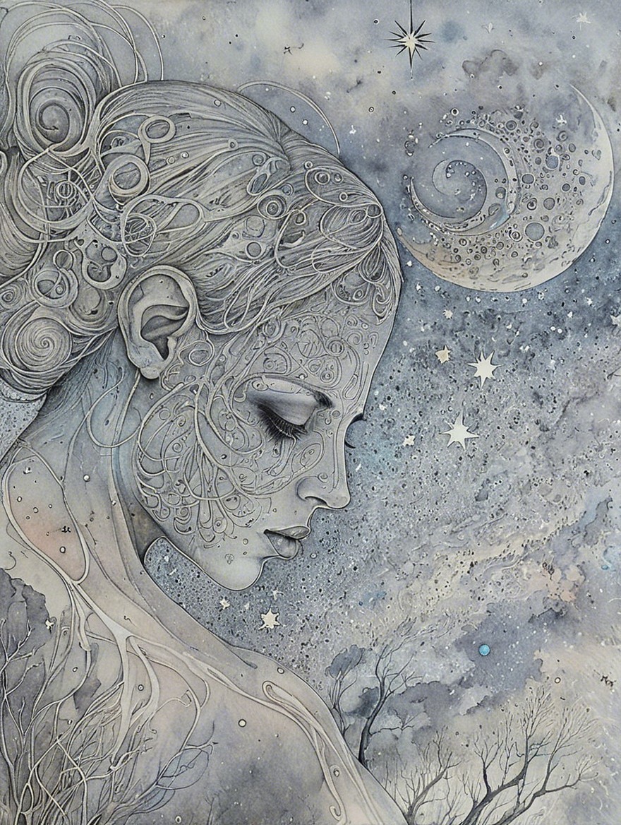 Prompt: Soft Watercolor & ink on silk painting of a Surrealistic Portrait by Beksinski of an ethereal Virgo astrological sign depicting a beautiful virgin maiden, which possess an unsettling beauty, apocalyptic and haunting atmosphere, hyperrealistic, sharp focus, Cameron Gray. Star & galactic nebula in the background. The background showcases a smoky and overcast atmosphere, in the cover of night under a full moon, dark, mysterious & eerie. Predominantly cool colours with rose, gold, rust, burgundy, and black. Soft watercolour, extra water in Art Deco by Annigoni, Egon Schiele, Milo Manara, Botticelli, Catrin Welz-Stein, Jean Metzinger, Klimt, perfect eyes, perfect handsface, highly detailed, complementary colours, hyper detailed. Watercolor and ink splatter, dynamic pose, dark blue background, unreal engine, greg Rutkowski, loish, rhads, beeple, makoto shinkai and lois van baarle, ilya kuvshinov, rossdraws, tom bagshaw, alphonse mucha, global illumination, detailed and intricate environment, chiaroscuro lit contrast.
