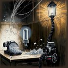 An old-fashioned workshop scene featuring an eclectic mix of vintage machinery, including a vacuum and lamp, surrounded by scattered debris and wires, creating a dynamic, industrial atmosphere.