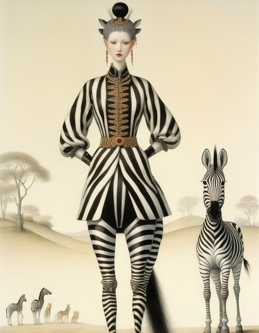 Surreal artwork: Woman in zebra attire with zebras in serene landscape