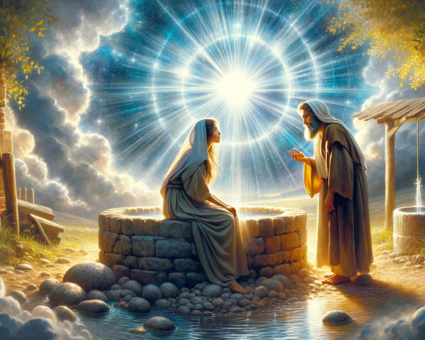 Un par de manos extendidas hacia adelante, filtran y reflejan la luz de un rayo luminoso que desciende desde el cielo. En el reflejo de la luz, surgen pequeños destellos o símbolos (como una paloma o un anillo luminoso) mientras la expresión del fondo es un atardecer luminoso en un paisaje de caminos abiertos, invitando a la esperanza y a la mediación de dones espirituales.