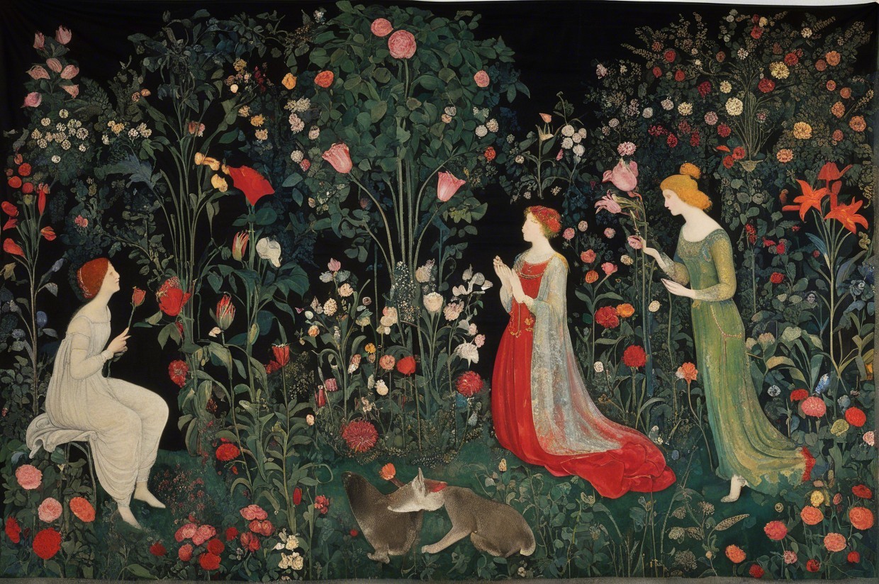 Three Women in a Garden Surrounded by Flowers