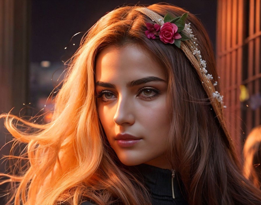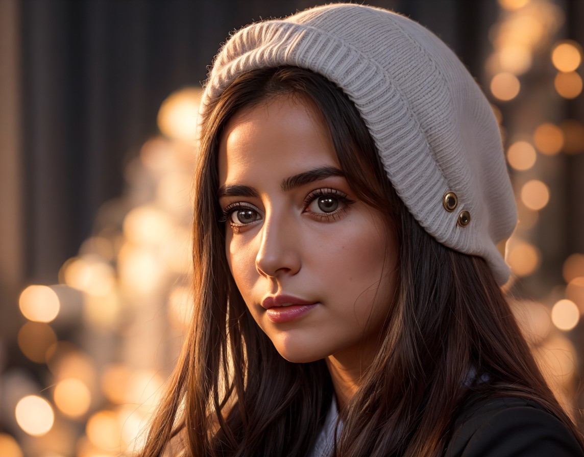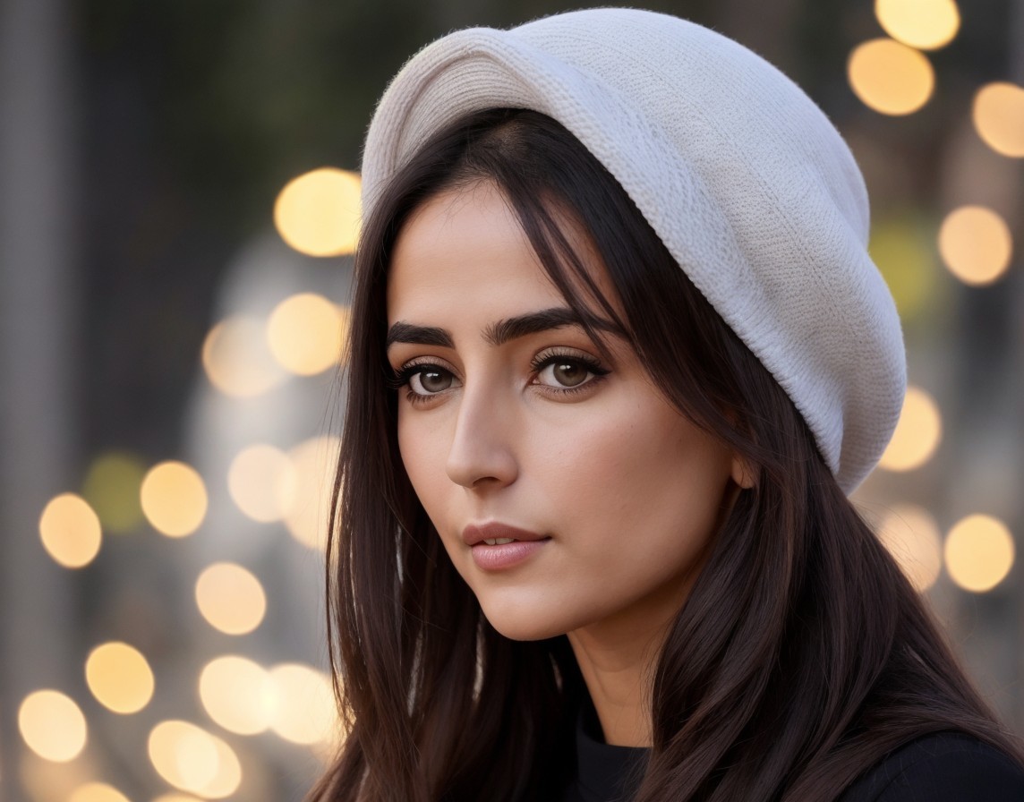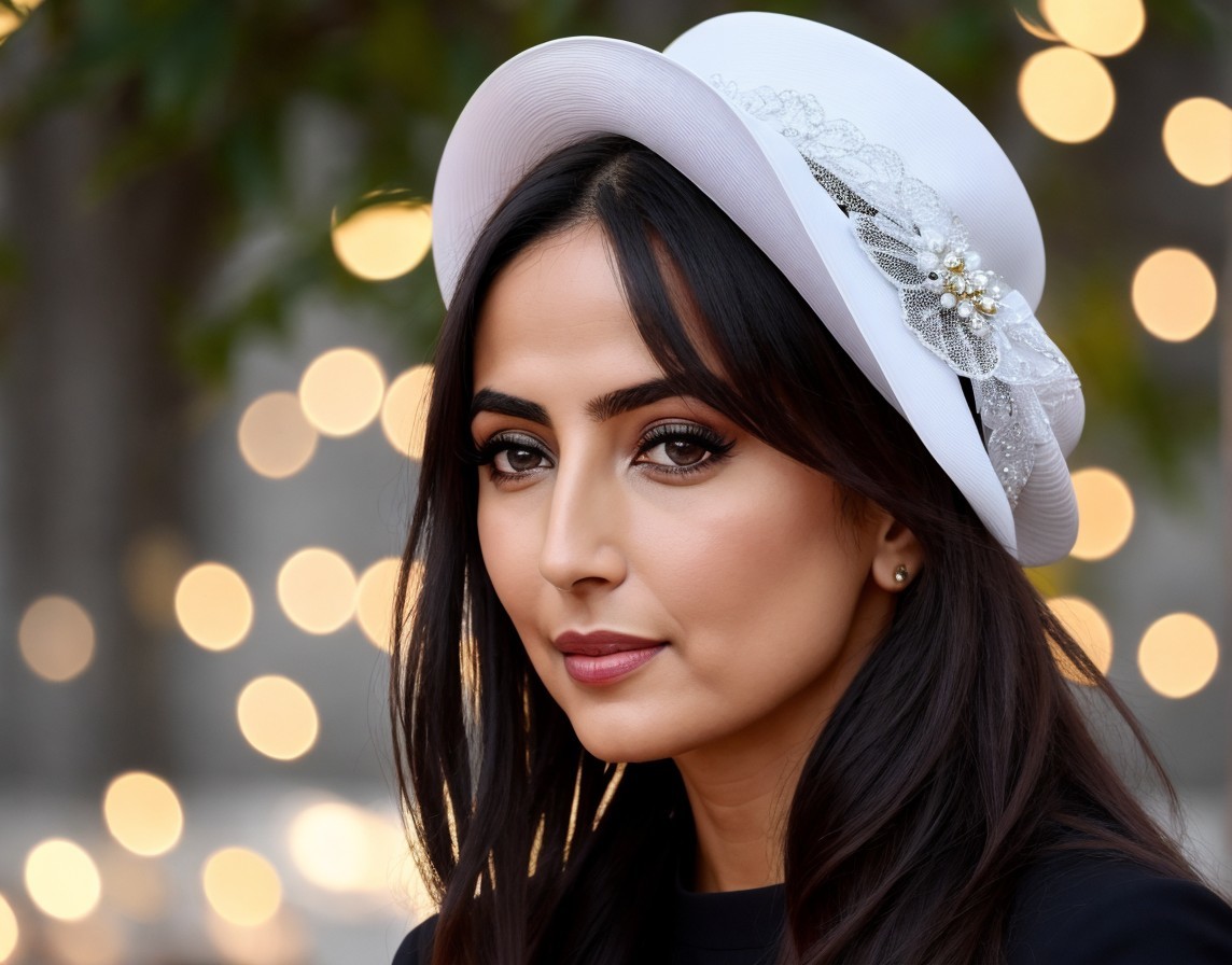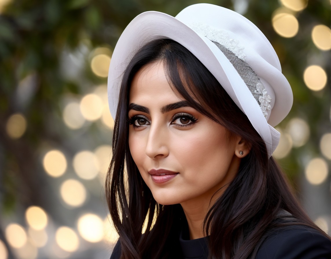 A woman with dark hair wearing a white hat and subtle makeup is posing in front of green foliage.