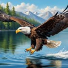 A majestic bald eagle swoops down over a serene lake, its wings spread wide against a backdrop of towering mountains and lush trees, capturing the essence of nature's beauty.