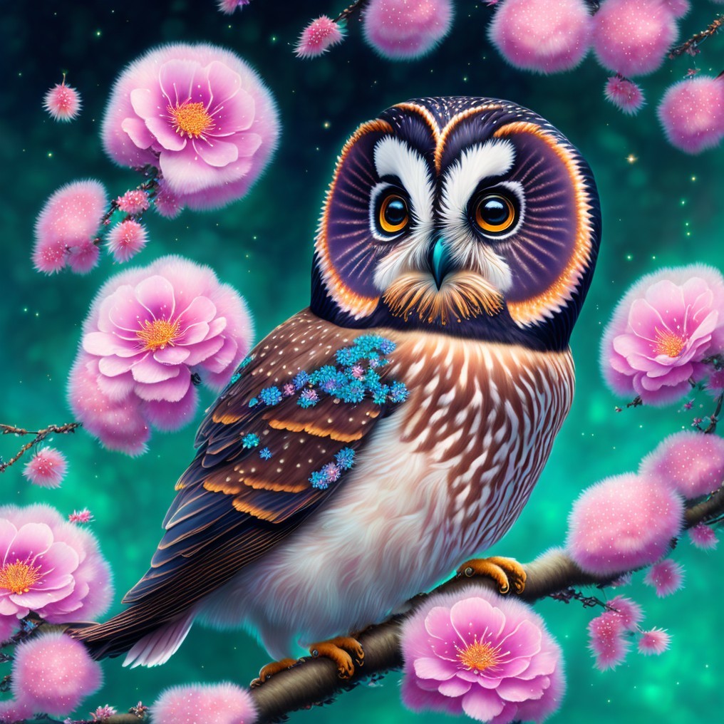 Prompt: An energy creature cute northern saw-whet owl sitting on top of a wonderful water sakura branch full of little flowers, tattoo design made of sacral geometry, nebula japanese temple on a background, dreamy, intricate, highly detailed, colorful, many petals, super highly detailed,