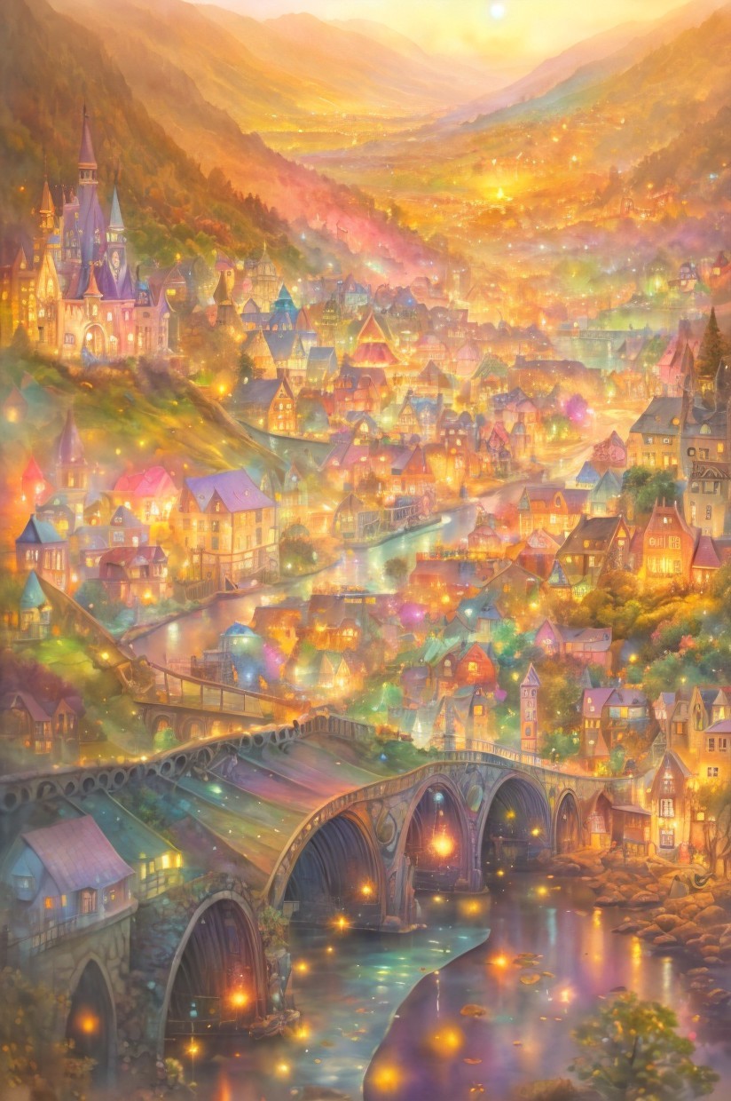 Fantasy landscape with whimsical houses, castle, bridge, and floating lanterns