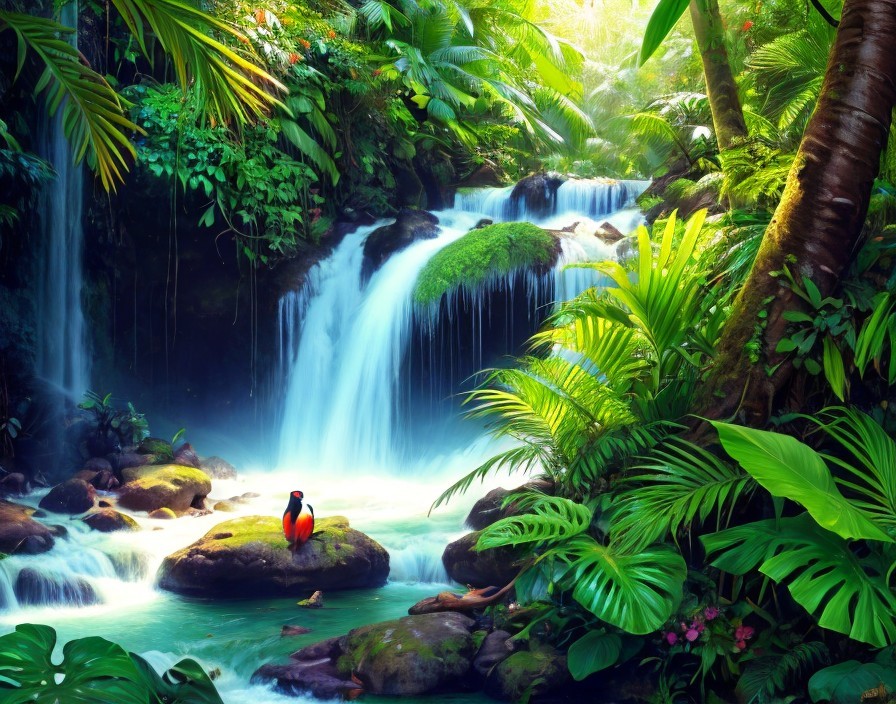 Prompt: "Lush tropical rainforest, vibrant flora and fauna, diverse plant species, exotic animals like toucans and monkeys, human figures in harmony with nature, flowing river, cascading waterfalls, colorful butterflies, dense foliage, sunlight filtering through the canopy, rich earthy tones, realistic and detailed illustration, dynamic composition, intricate textures, wildlife interaction, warm natural lighting, by Robert Bateman and Henri Rousseau, Artstation."