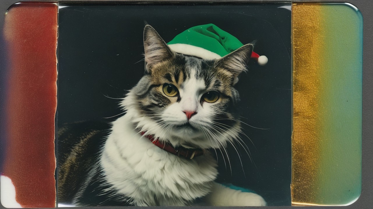 A festive cat with a fluffy coat and striking eyes wears a small green and red Christmas hat, posing against a dark background with colorful borders.