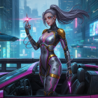 A futuristic scene featuring a cybernetic woman in a sleek, metallic bodysuit, holding a glowing device. She's standing beside a vibrant pink car, with a neon-lit cityscape in the background.