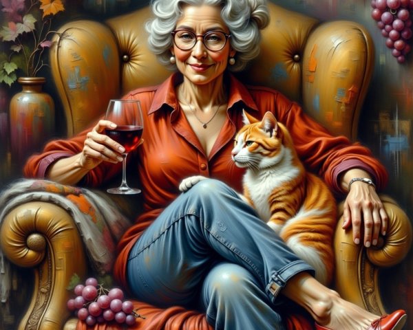 A picturesque autumn landscape features a vineyard with vibrant orange and yellow leaves. A charming cottage stands near a dirt path, surrounded by baskets of fruits, as the sun sets in the background.