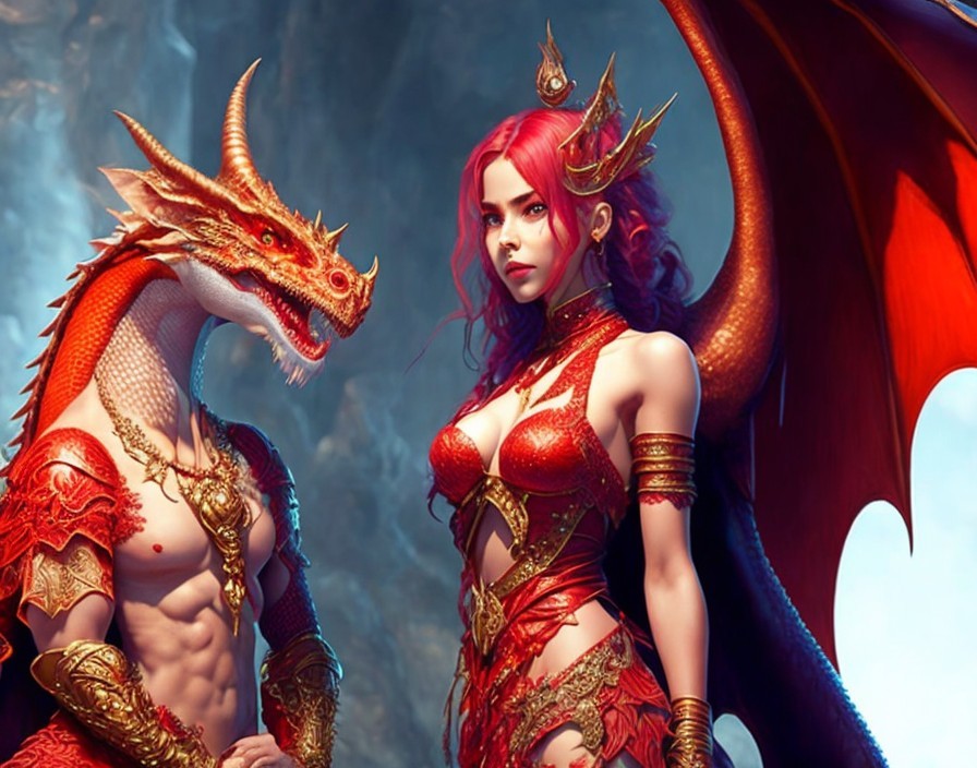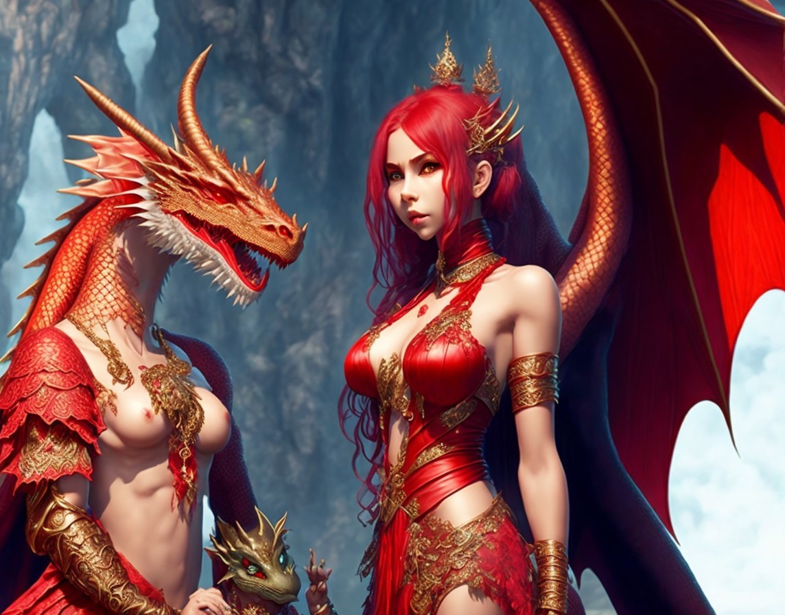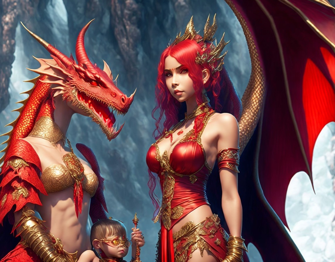 A red-haired warrior in ornate armor stands beside a red dragon, holding a baby with a curious expression.