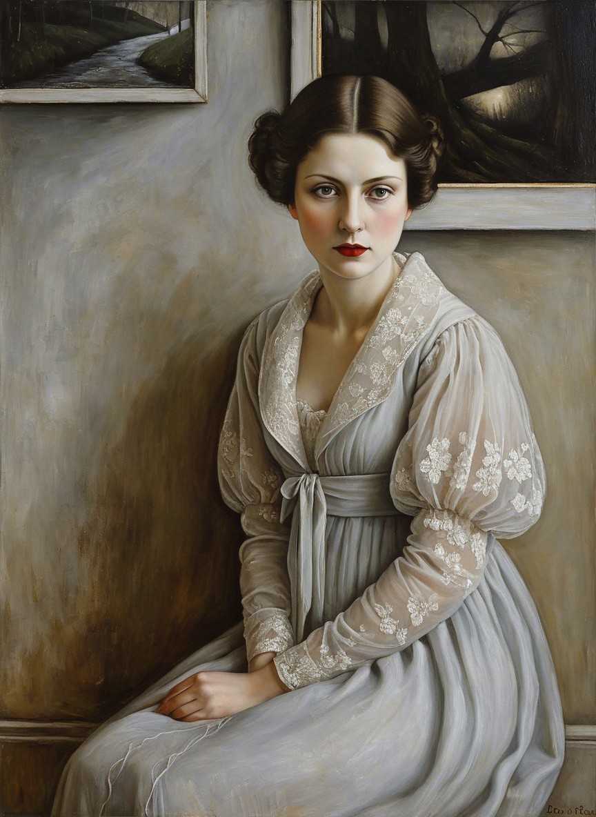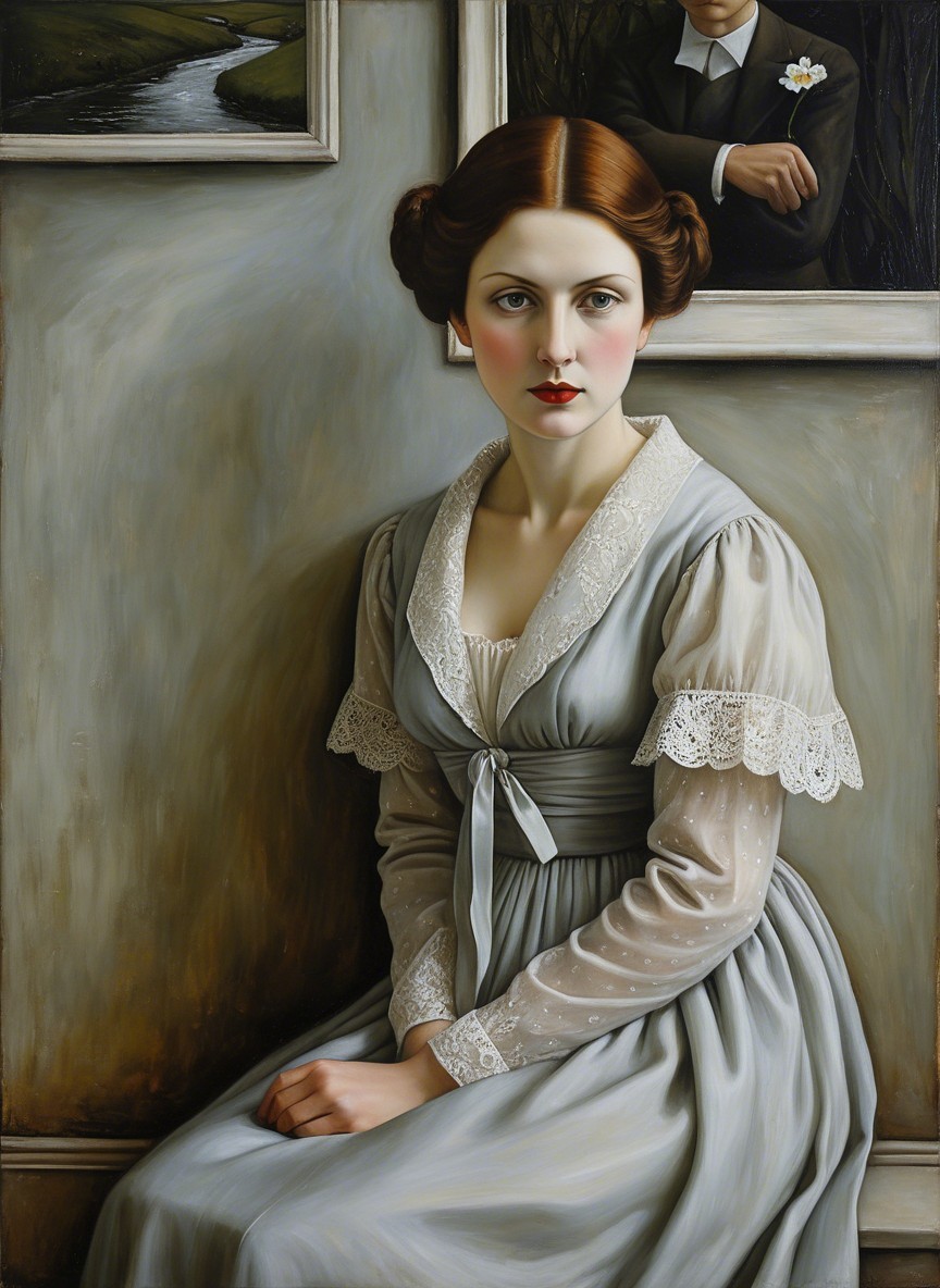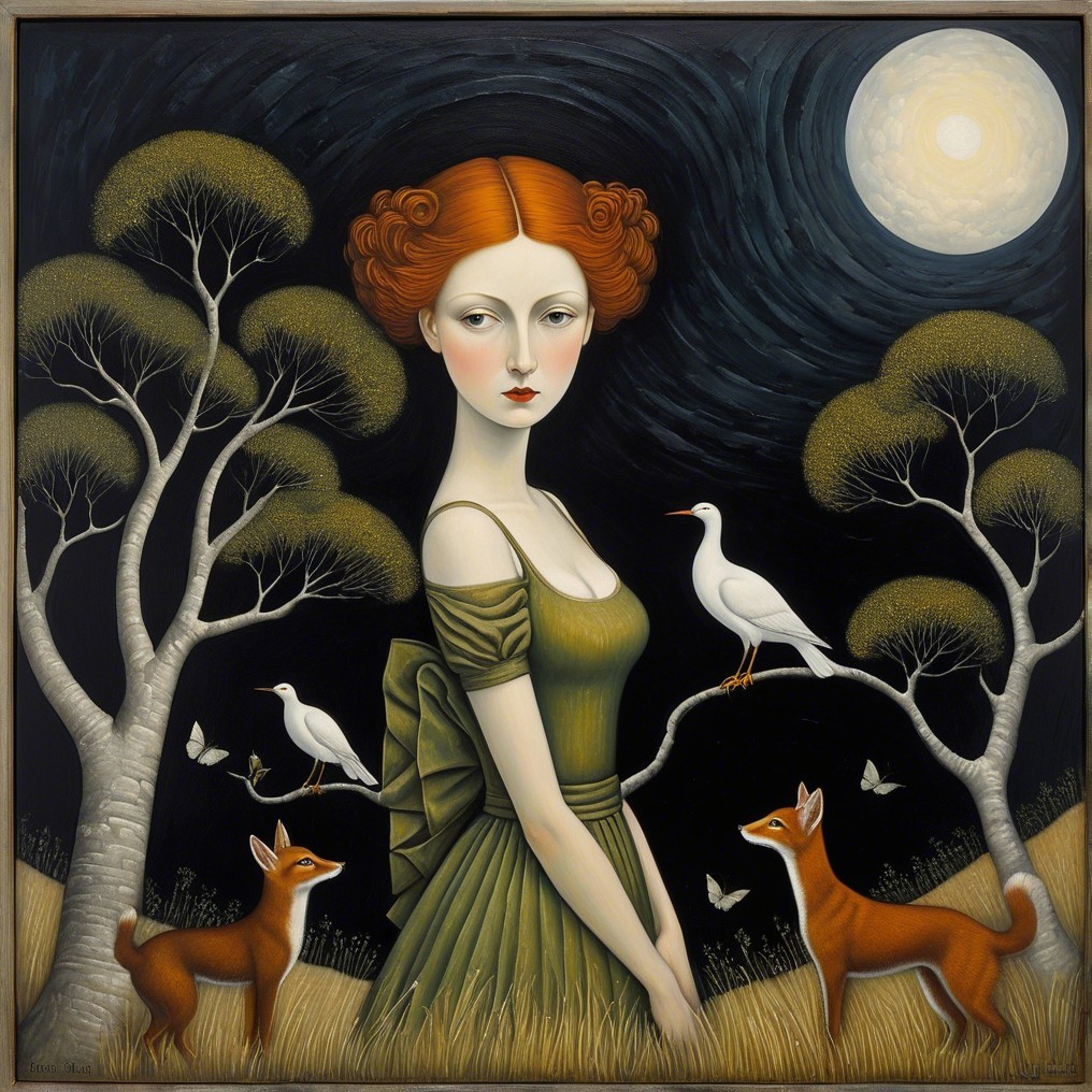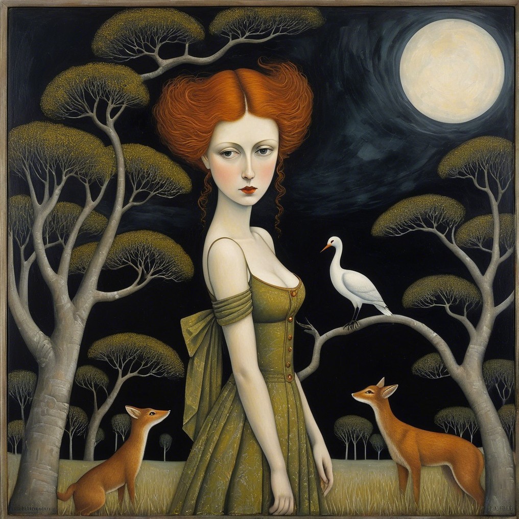 A woman with red hair in a black dress holds a rose against a dark, moonlit landscape, surrounded by three oranges and bare trees, evoking a mysterious, surreal atmosphere.