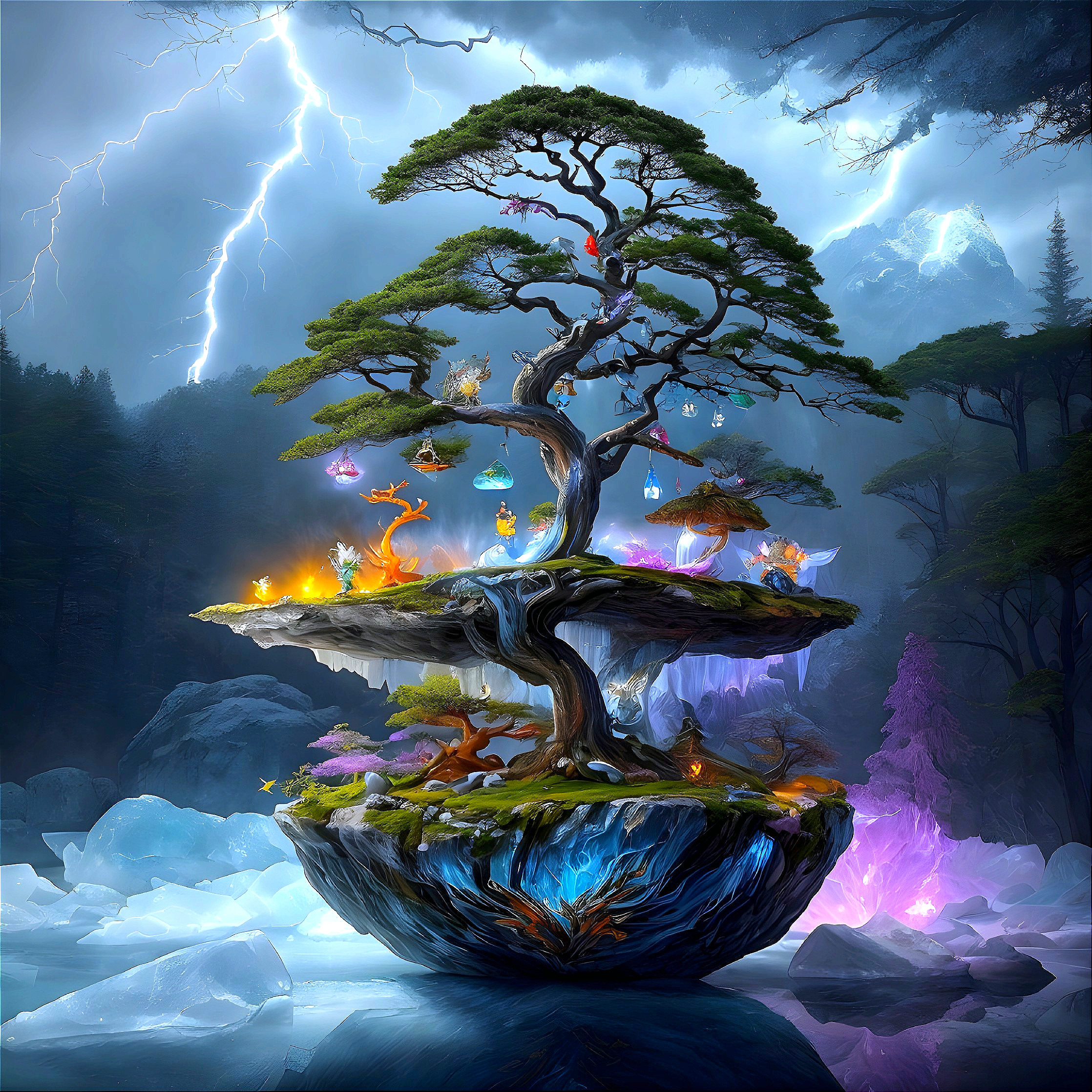 A stunning ice bonsai in a parallel world, glowing with vibrant hues and surrounded by crackling lightning bolts. The artwork is a fusion of surrealistic and fantastical elements, transporting viewers to a mesmerizing realm of artistic wonder.