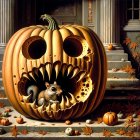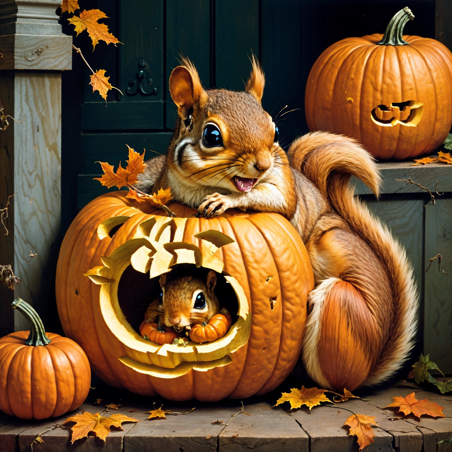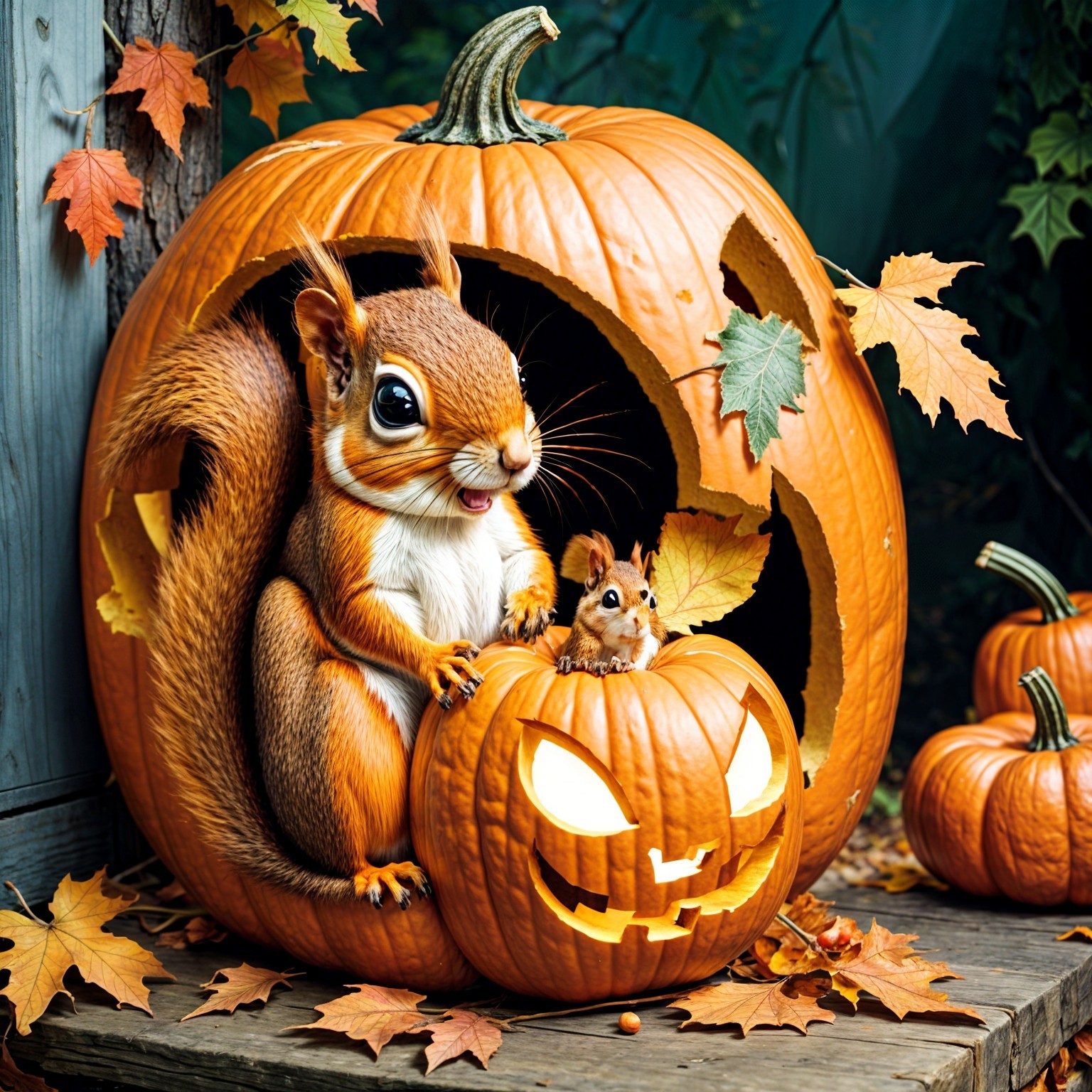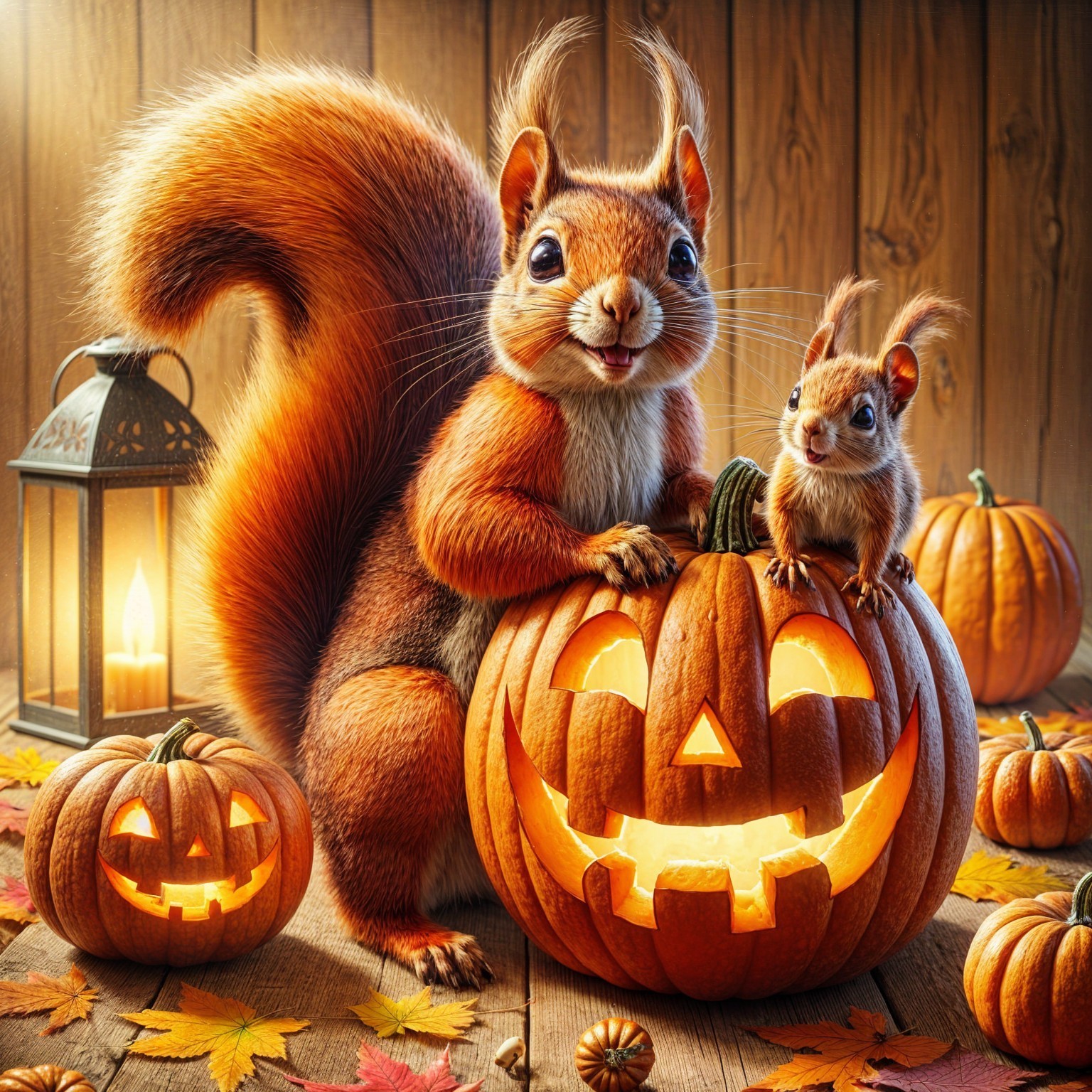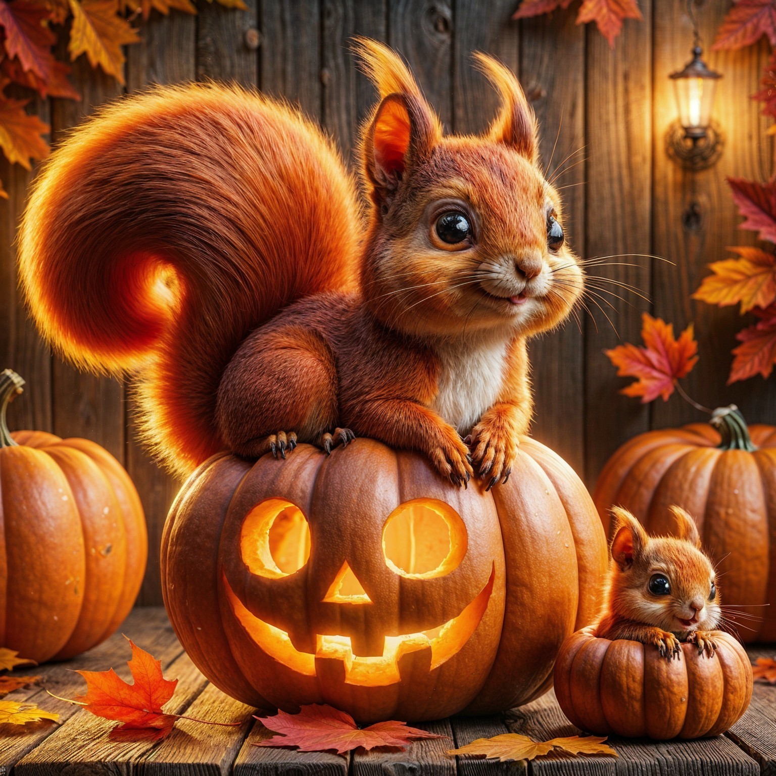 A cheerful squirrel sits atop a wooden platform, holding a carved jack-o'-lantern. Surrounded by pumpkins and autumn leaves, it exudes a festive Halloween spirit.