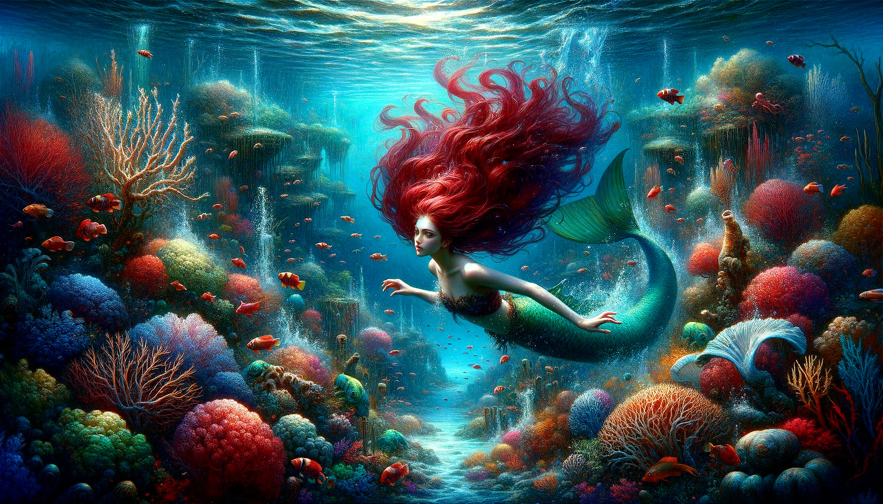A stunning depiction of a burgundy-haired mermaid with fair skin diving into a vibrant underwater world filled with colorful fish and corals. The intricate details and dynamic lighting create a mesmerizing and fantasy-filled masterpiece in 8k resolution.