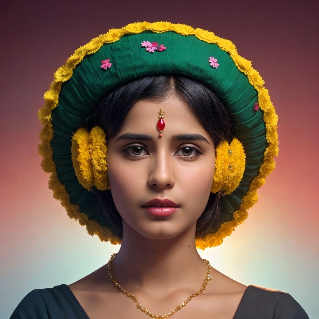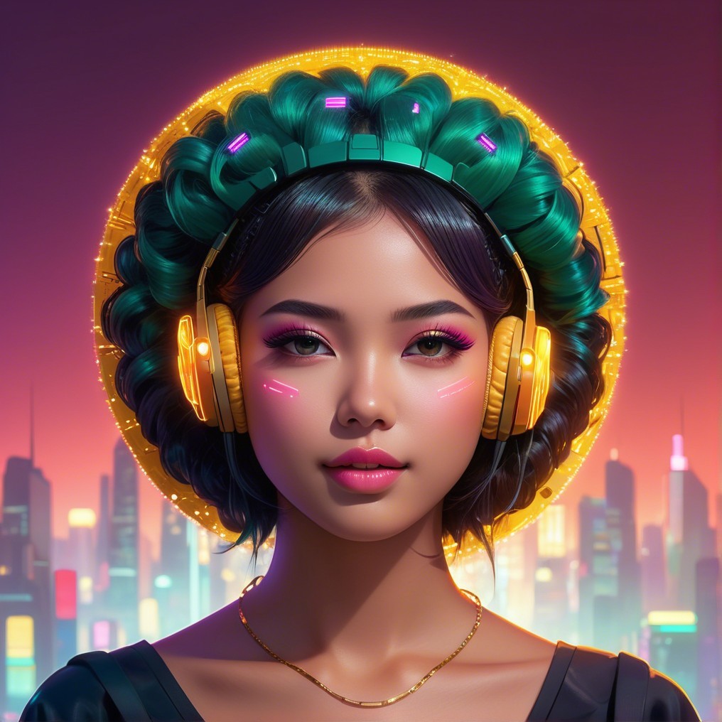 A striking portrait of a young woman with vibrant teal curly hair, wearing golden headphones. She features bold makeup with colorful accents set against a dazzling, abstract background.