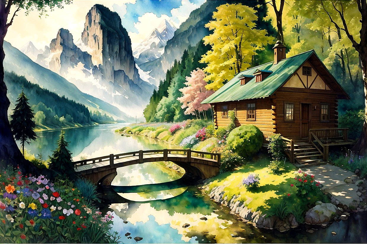 Prompt: Triangular reality. Landscape. Watercolor painting . Fanastic style of Thomas Wells Schaller and Egon Schiele. Glorious river in the woods. Flowery. WOoden bridge and cabin.