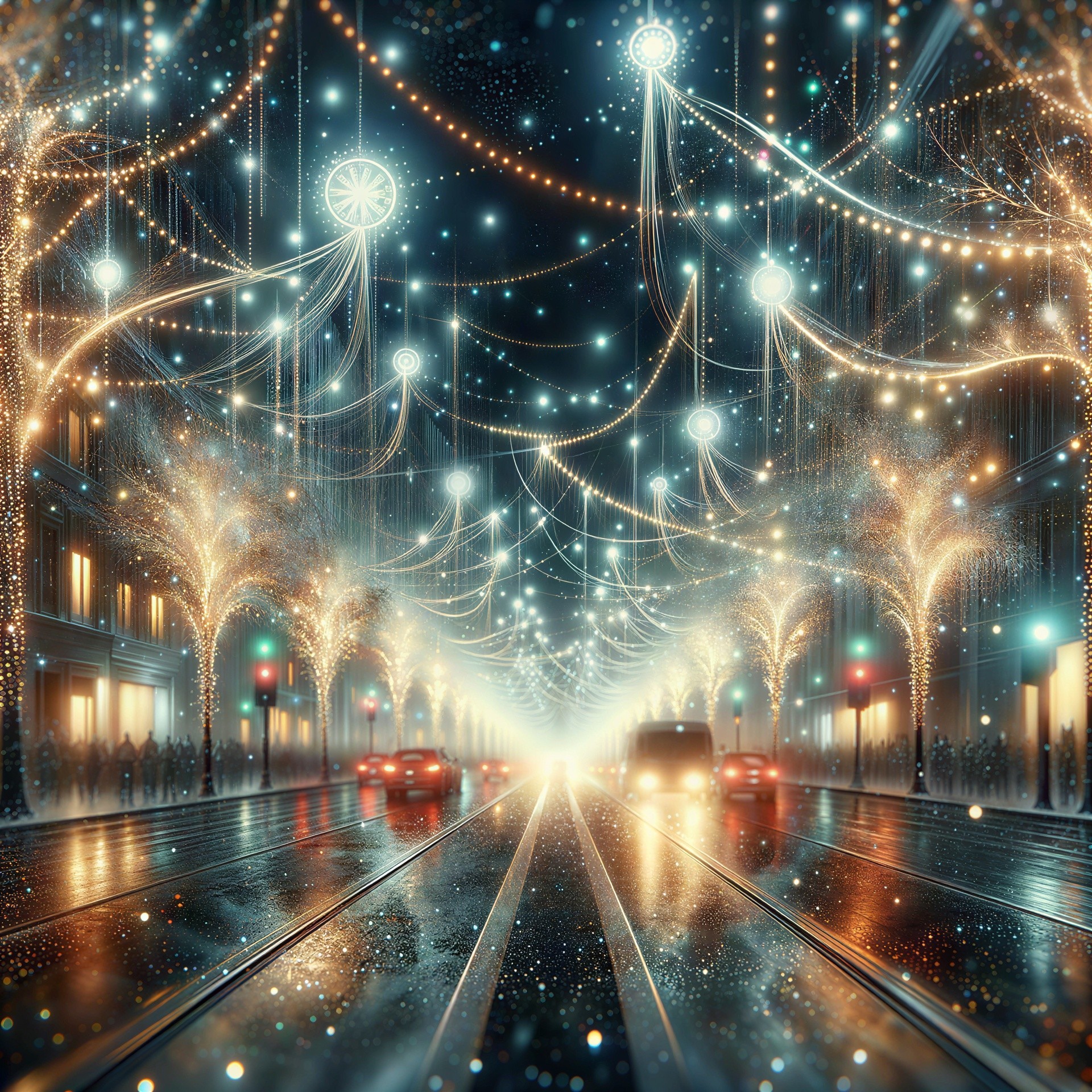 A digitally enhanced, futuristic night scene depicting a street lined with trees and buildings, illuminated by an abundance of glowing, abstract light structures and patterns. The overall lighting effect is that of a dark, sparkling night, with a rich color palette of contrasting golden yellows, oranges, mint green, and blue.