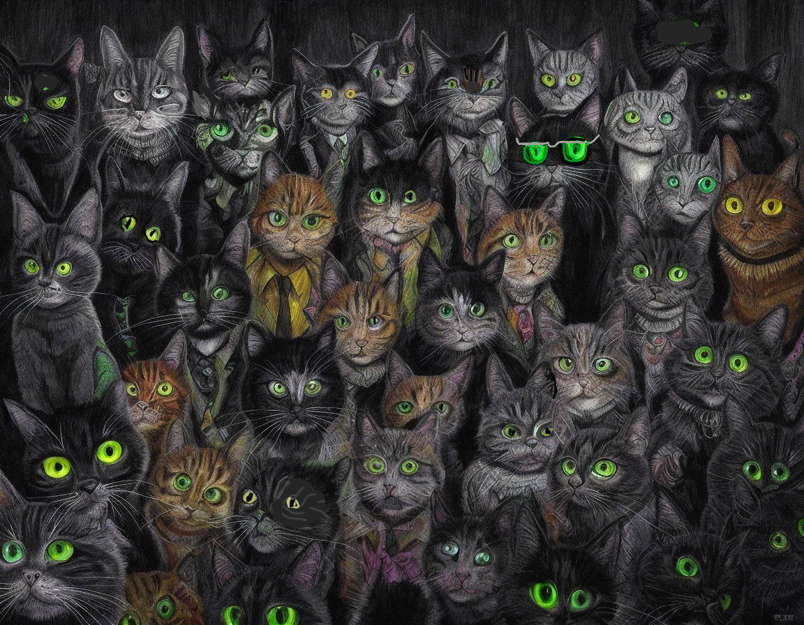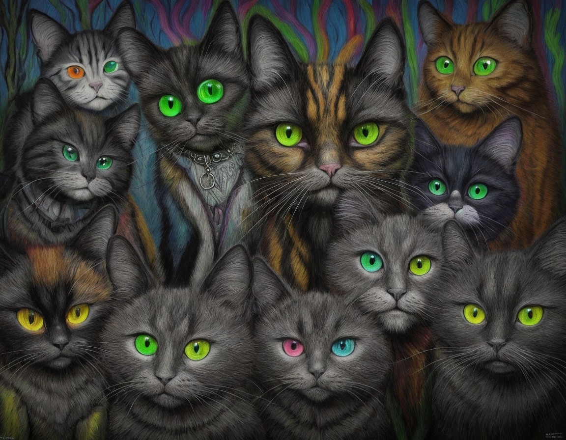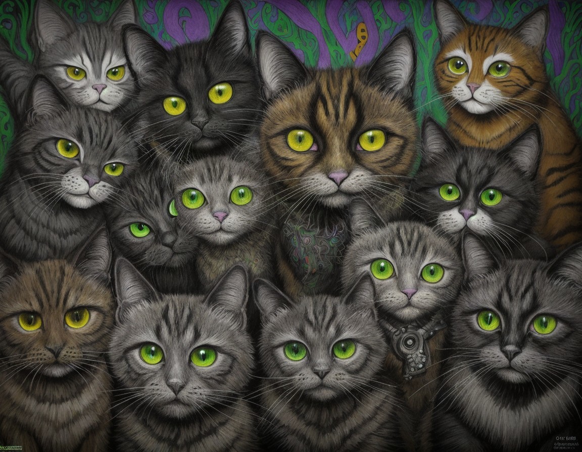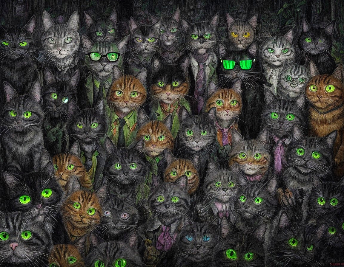 + Prompt:Modern Art, chalk drawing, fine lines, gang of cats besieging the area at night, green glowing eyes with black pupils, clearly visible white whiskers, detailed brown fur, grey, dark grass, inspired by André Masson and Charles van den Eycken
