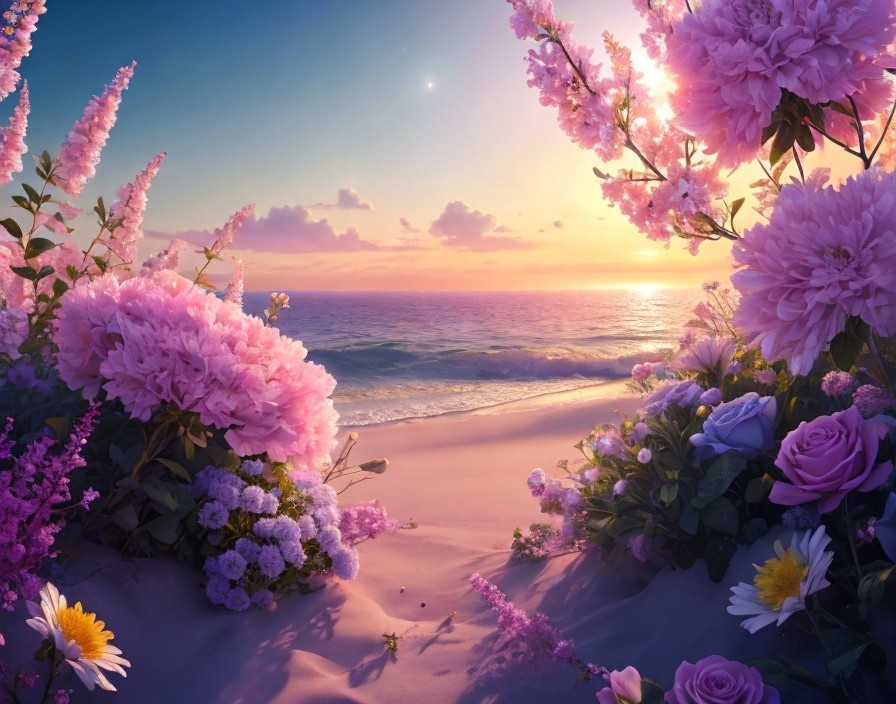 Vibrant flowers, desert pathway, rocky spires under twilight sky