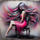 A striking art piece featuring a woman with vibrant, flowing pink and purple hair, seated gracefully in a modern chair. Behind her, a dynamic splatter of colorful paint creates a lively backdrop.