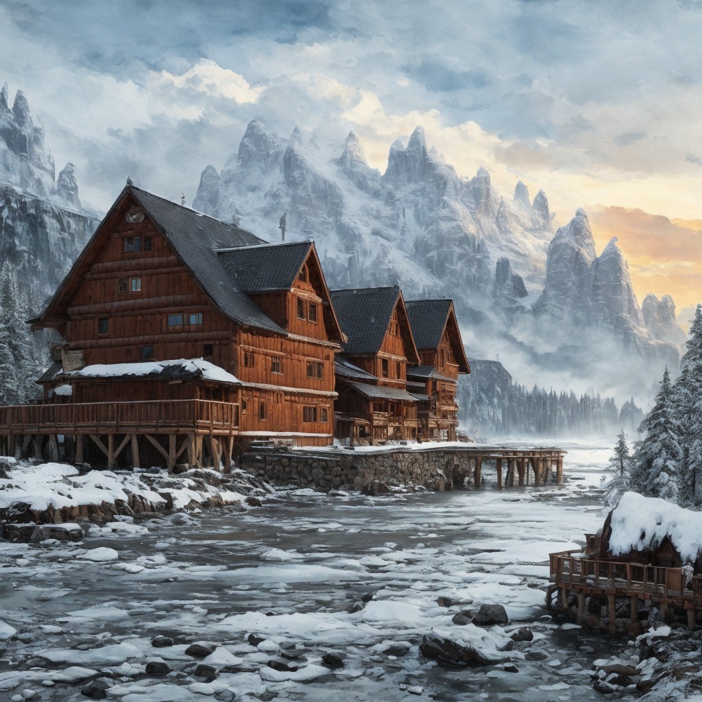 Prompt: "Architecture of Siberia before the Great Flood in ice cliffs, log buildings, watchtowers, arches, staircases, log bridge, port, harbor, harbor cranes, mountains around, clouds, mixed technique, wet to wet watercolor, architectural drawing, clause, pen, (black ink), colored markers, muddy tones, sharp focus, high resolution, colored, intricate detailed, complex detail, colorful"
