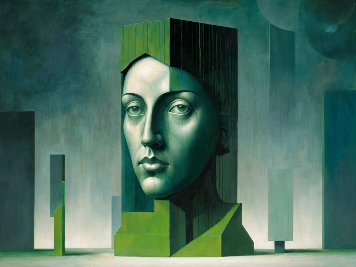 The image features a stylized head with a serene expression, surrounded by abstract shapes and forms in various shades of green, creating a harmonious and intriguing composition.