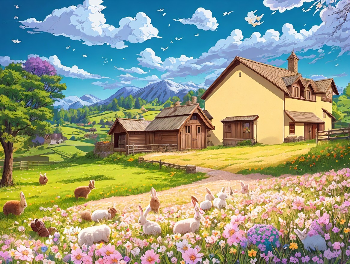 + Prompt:Extremely detailed, badass 2d illustration, The artwork features an easter picture, rabbits, easter eggs, chocolate eggs, lambs, spring birds, fields, trees, high contrast, blended colors, cel shaded, gradation, striking detailed art style, outline, no text