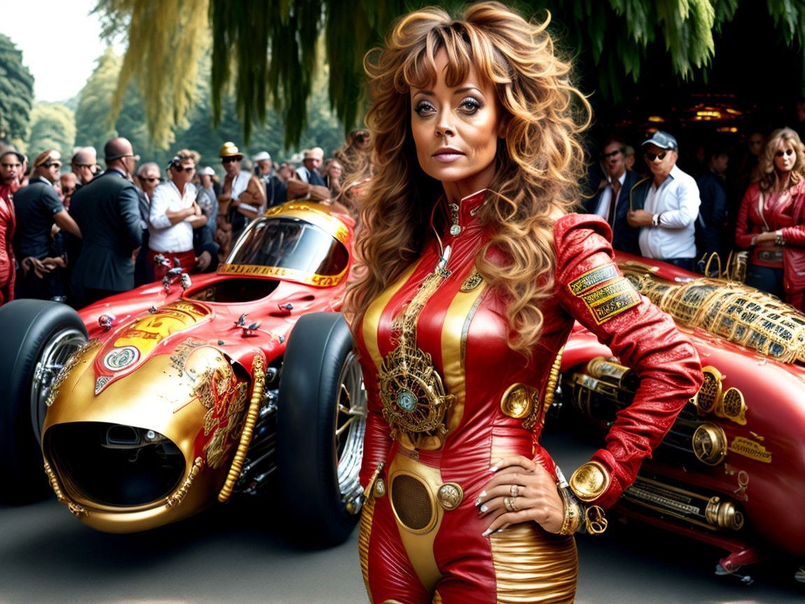 The image features a glamorous woman with voluminous hair in a striking red and gold outfit, standing confidently near a futuristic-looking race car, with a crowd of stylish onlookers behind her.