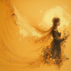 A serene angelic figure with flowing hair and delicate wings stands gracefully, holding a bouquet of vibrant flowers. Surrounded by a warm, glowing aura, the scene exudes peace and beauty.