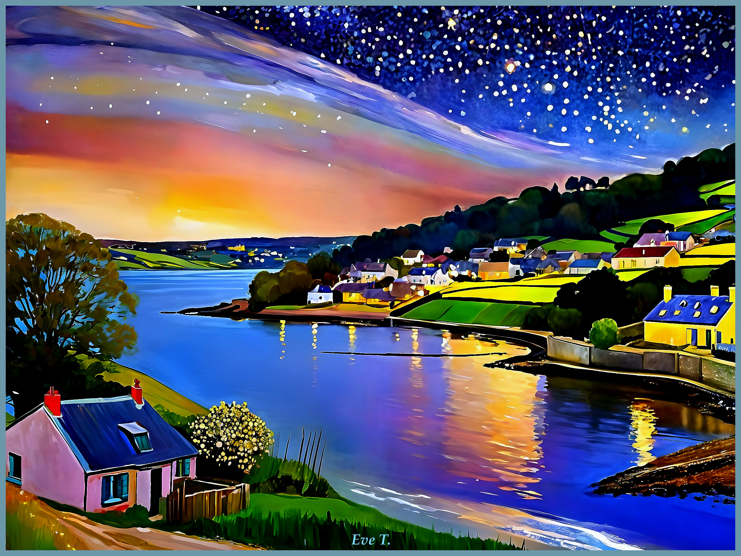 A vibrant landscape at dusk features the tranquil Teign estuary, bordered by lush green hills and quaint houses. Stars twinkle above as the sunset casts colorful reflections on the water.