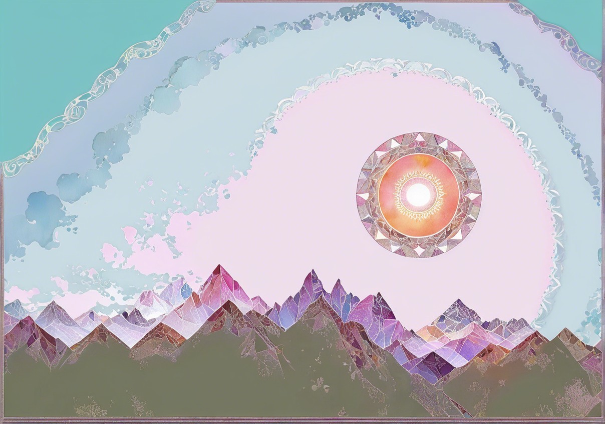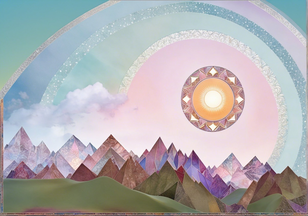 The image depicts a colorful, surreal landscape with majestic mountains under a radiant sun. Soft gradients blend harmoniously, creating an ethereal atmosphere filled with light and tranquility.
