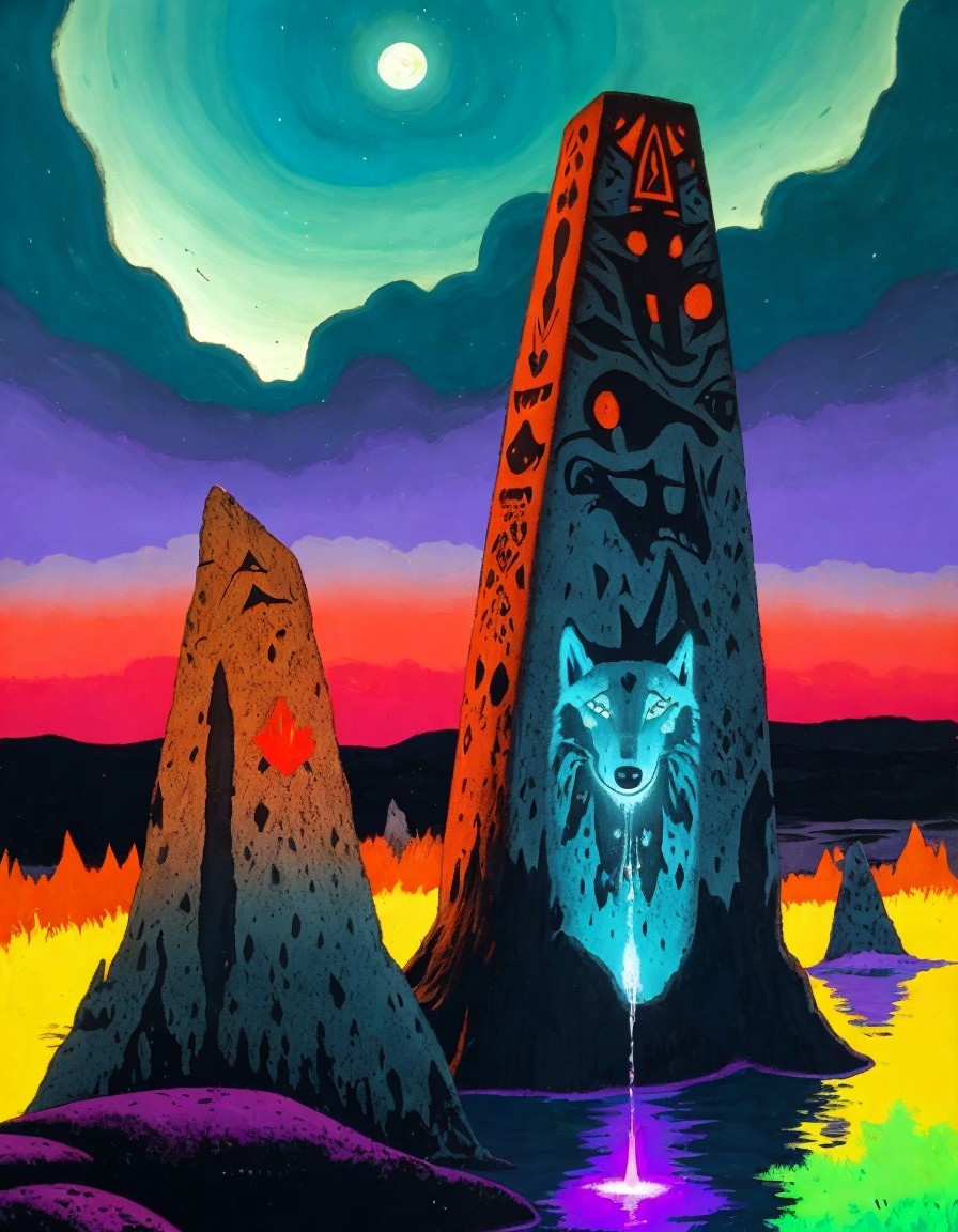 Prompt: "surrealistic moomin-land landscape, glowing wolf-creatures dancing around great totemic menhir covered with glowing petroglyphs, midnight tones, lightings, high definition by Rudolf Koivu, Hugo Simberg, Akseli Gallen-kallela, Arkhip Kuindzhi, Bosch; art nouveau surrealistic fantasy painting; ink flowing splash art, extreme detail, oil on canvas, soft brush"