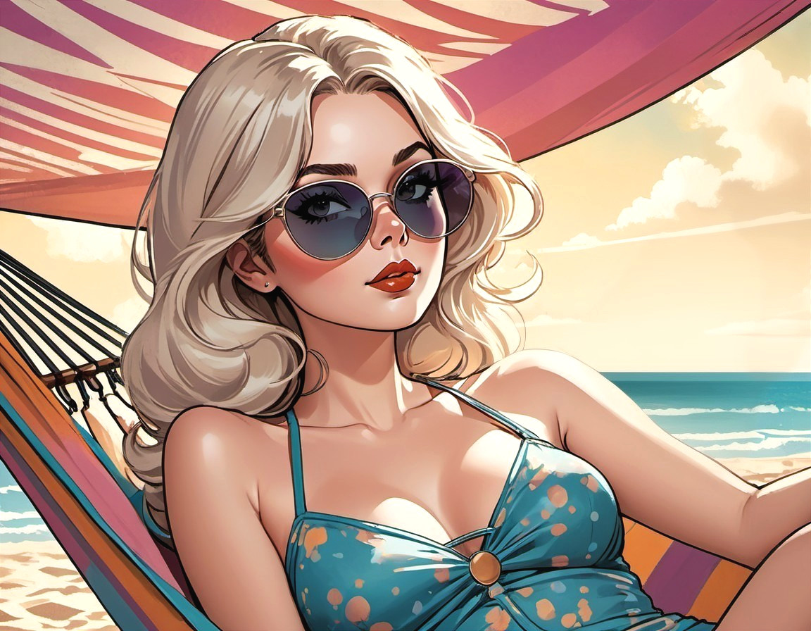 (Try it from Ognee) - A stylized illustration of a woman with blonde hair and sunglasses, relaxing on a hammock at the beach under a striped canopy.
