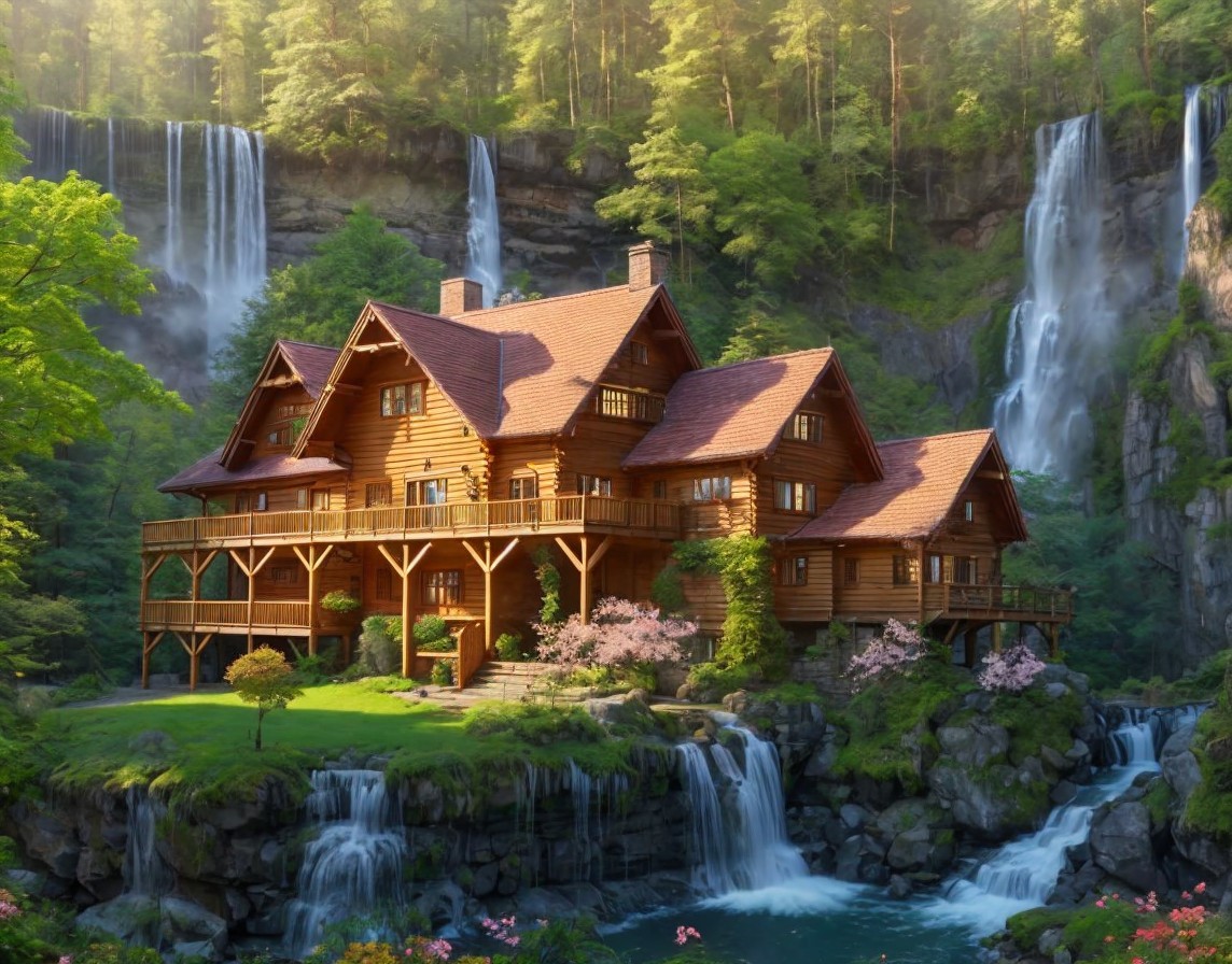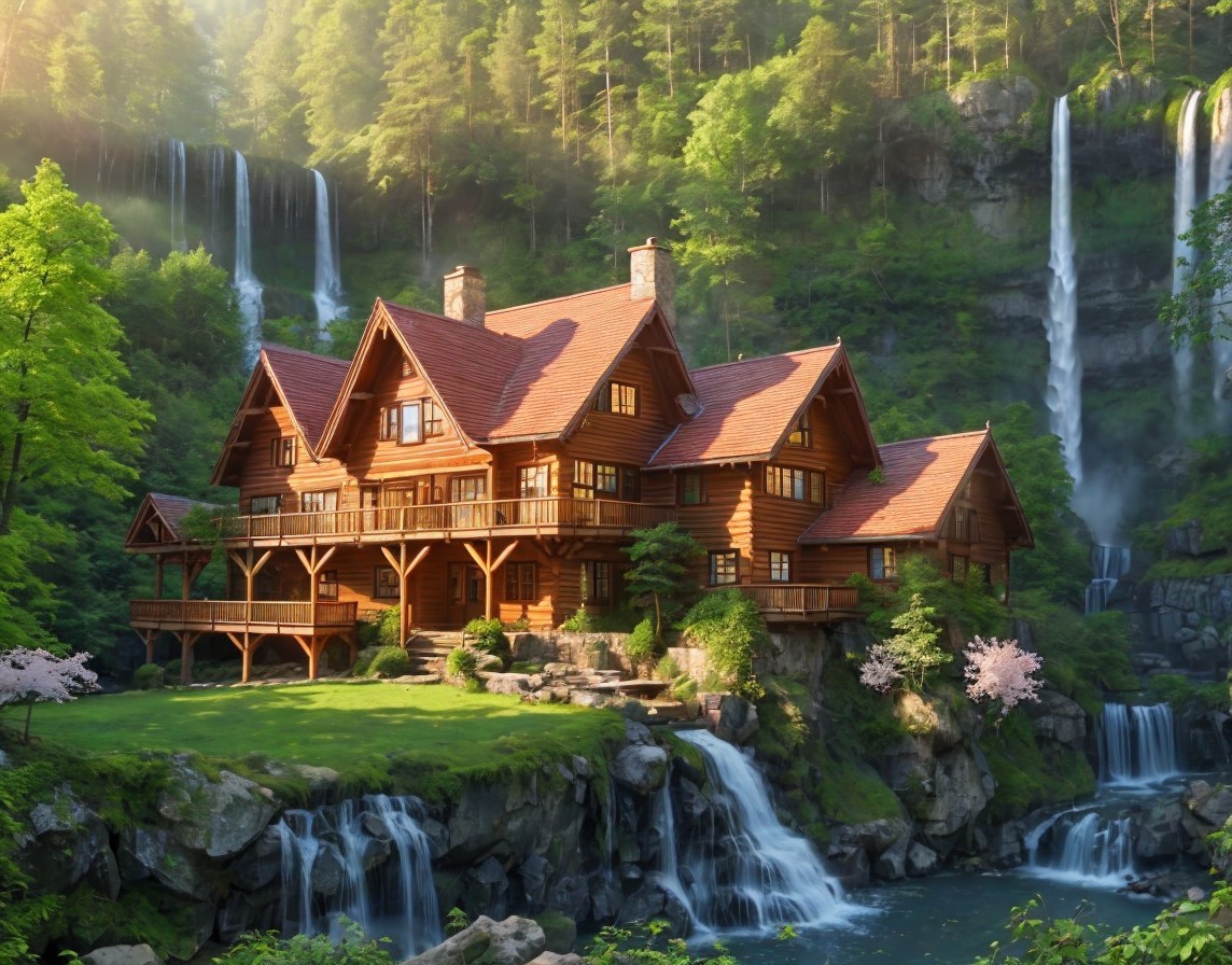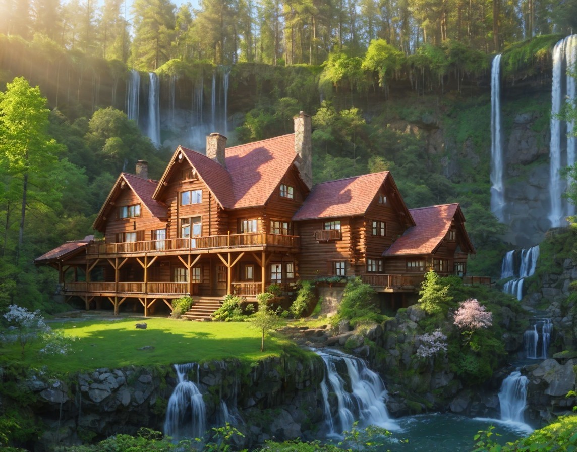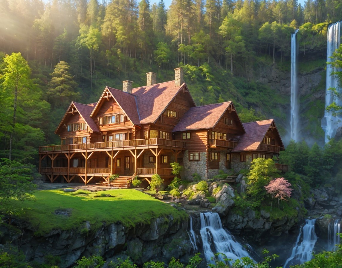 Idyllic log cabin nestled on verdant cliffs with majestic waterfalls in serene, sunlit woodland.