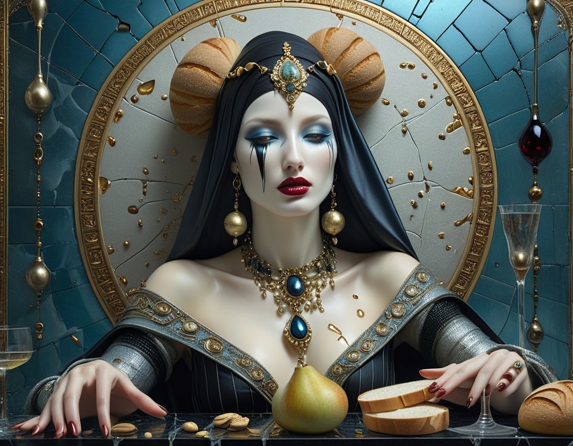 Prompt: Warm light cascades over the scene, set against a cracked canvas background with spilled wine marks. Glossy black glass reflections highlight the intricate details, while decaying hyper-textured fruit, stale bread rolls, nuts and melting camembert cheese. Render the image in 8k resolution, using cool blues and silvers to enhance the futuristic surrealism. Emphasize intricate fruit and glass textures, captivating light reflections, and polished object exteriors. Follow the rule of thirds for composition, and incorporate a matte finish in the style of Surrealist masters. Modifiers: trending on Artstation highly detailed intricate crisp quality Unreal Engine cinematic composition SALVADOR DALI Surrealism crisp realism perfect facial features perfect hands 8 K High Octane Render perfect hand anatomically correct features 64K, UHD, HDR, HQ Sylverdali Perfect hands Perfect hands perfect formed hands AIVision model AIvision Aligram Award winning photography intricate wallpaper aquarell alcohol ink 4k 4K 3D Perfect Proportional Anatomy detail high definition cinematic postprocessing beautiful award winning hyperrealistic ultra detailed hyper realistic metal textures crisp contrasts Melting dripping chrome, Highly textured old maters painting cracked textured canvas oil on cracked textured canvas oil on canvas old Masters highly detailed highly detailed highly detailed intricate hyper-realistic textured fruit, nuts cheese and stale bread