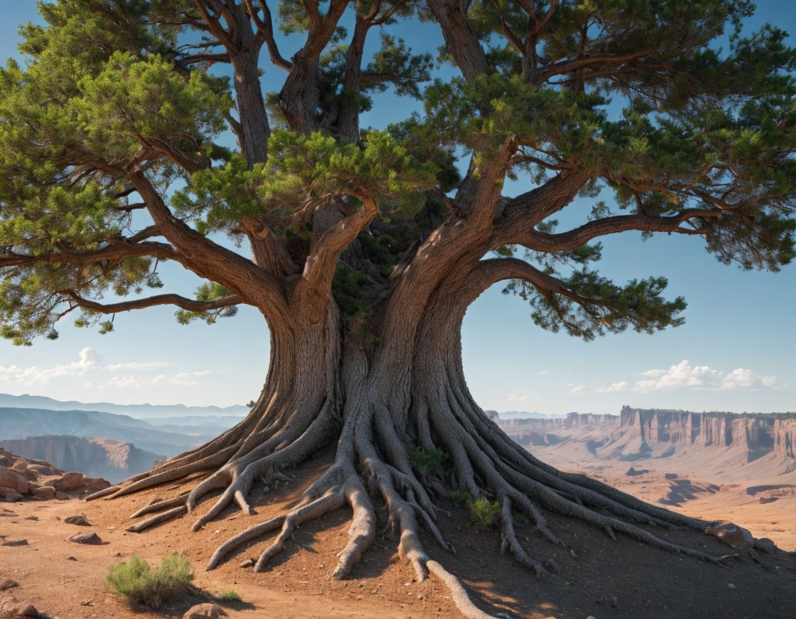 Ancient Tree on Red Terrain with Rocky Mountains Background