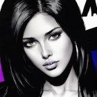 A striking black-and-white portrait of a young woman with long hair adorned with flowers, set against vibrant geometric backgrounds of purple and turquoise, creating a bold contrast.