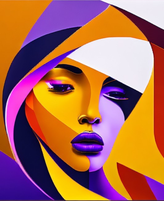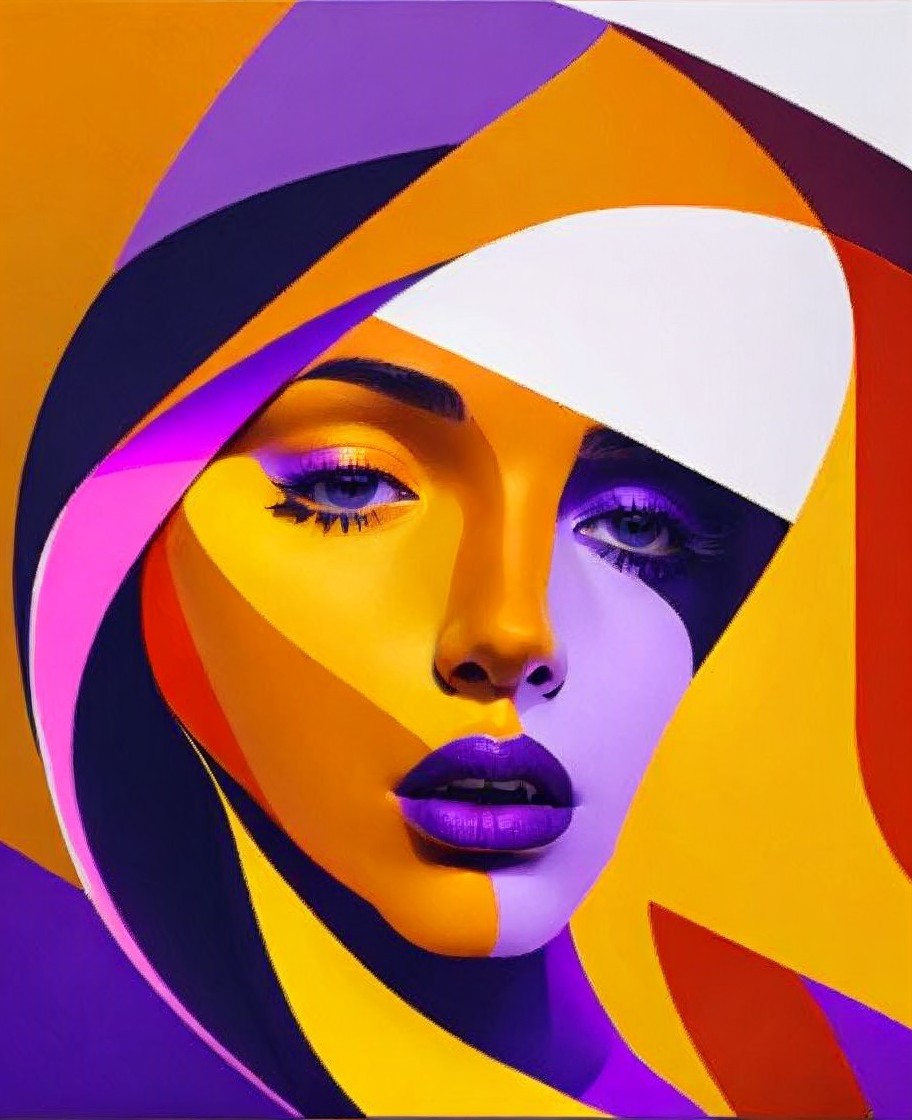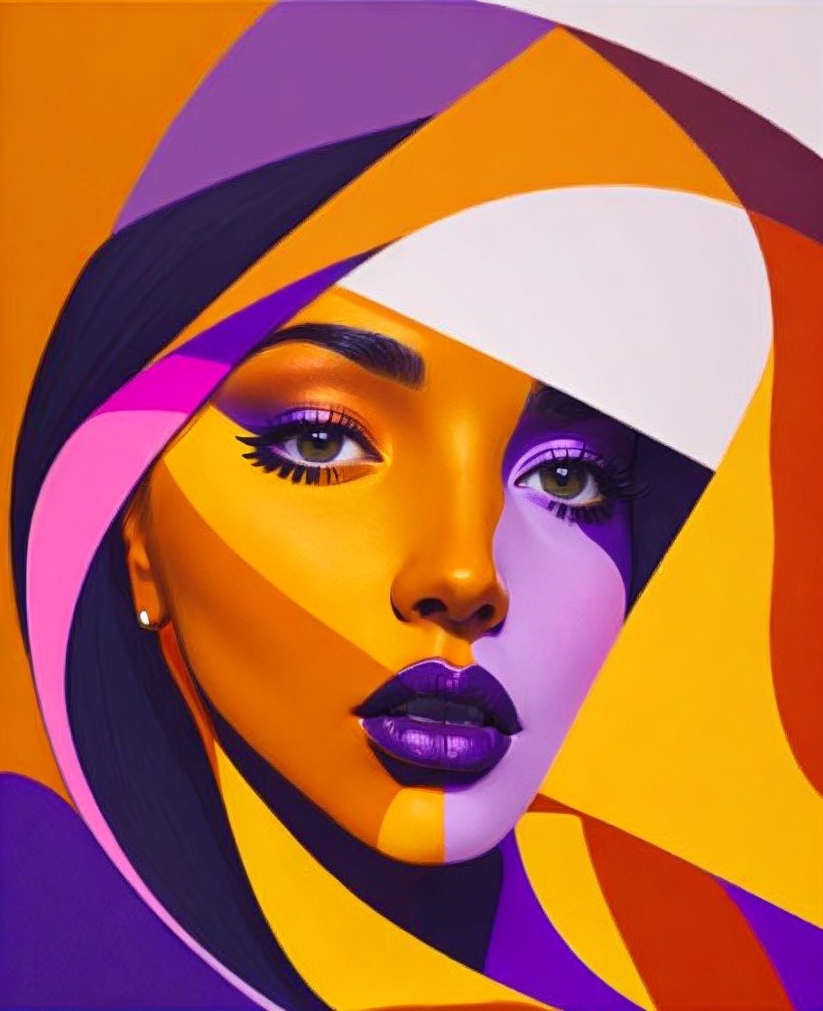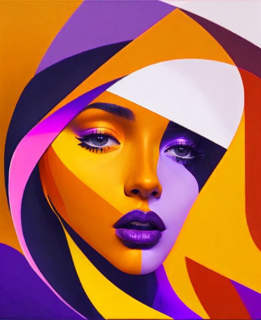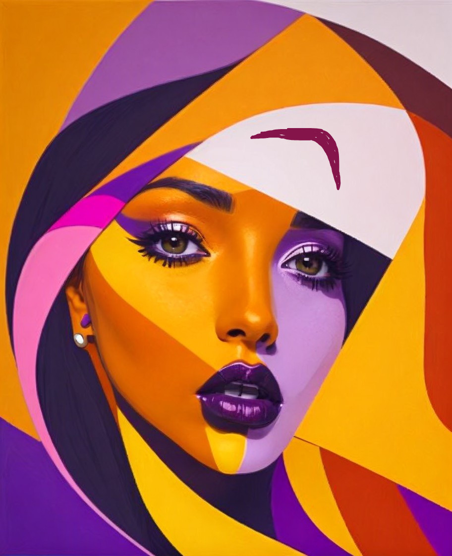 Vibrant portrait of a woman with purple and yellow hues and a swirled abstract pattern over her face.