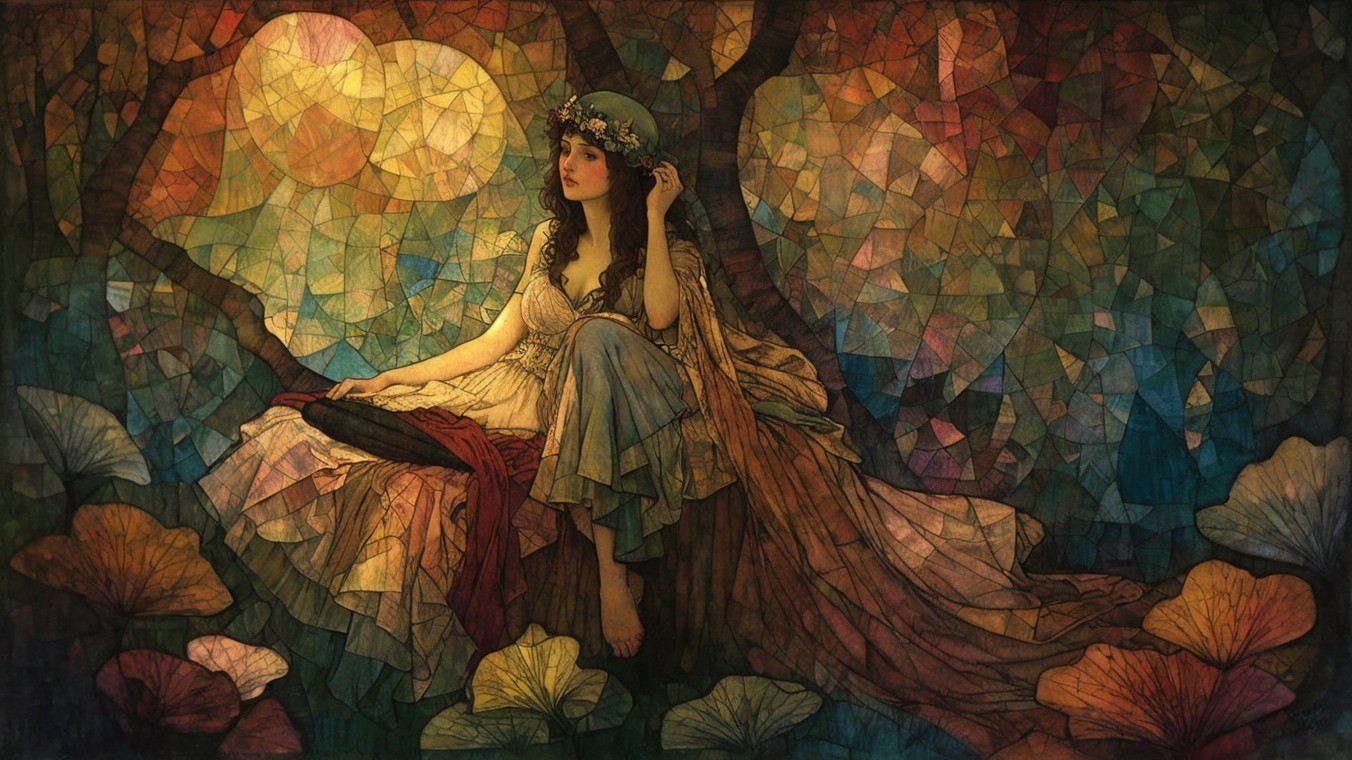 A serene woman in a flowing dress sits amidst vibrant stained glass patterns. She wears a floral hat and holds an item, surrounded by delicate flowers and soft, warm light.