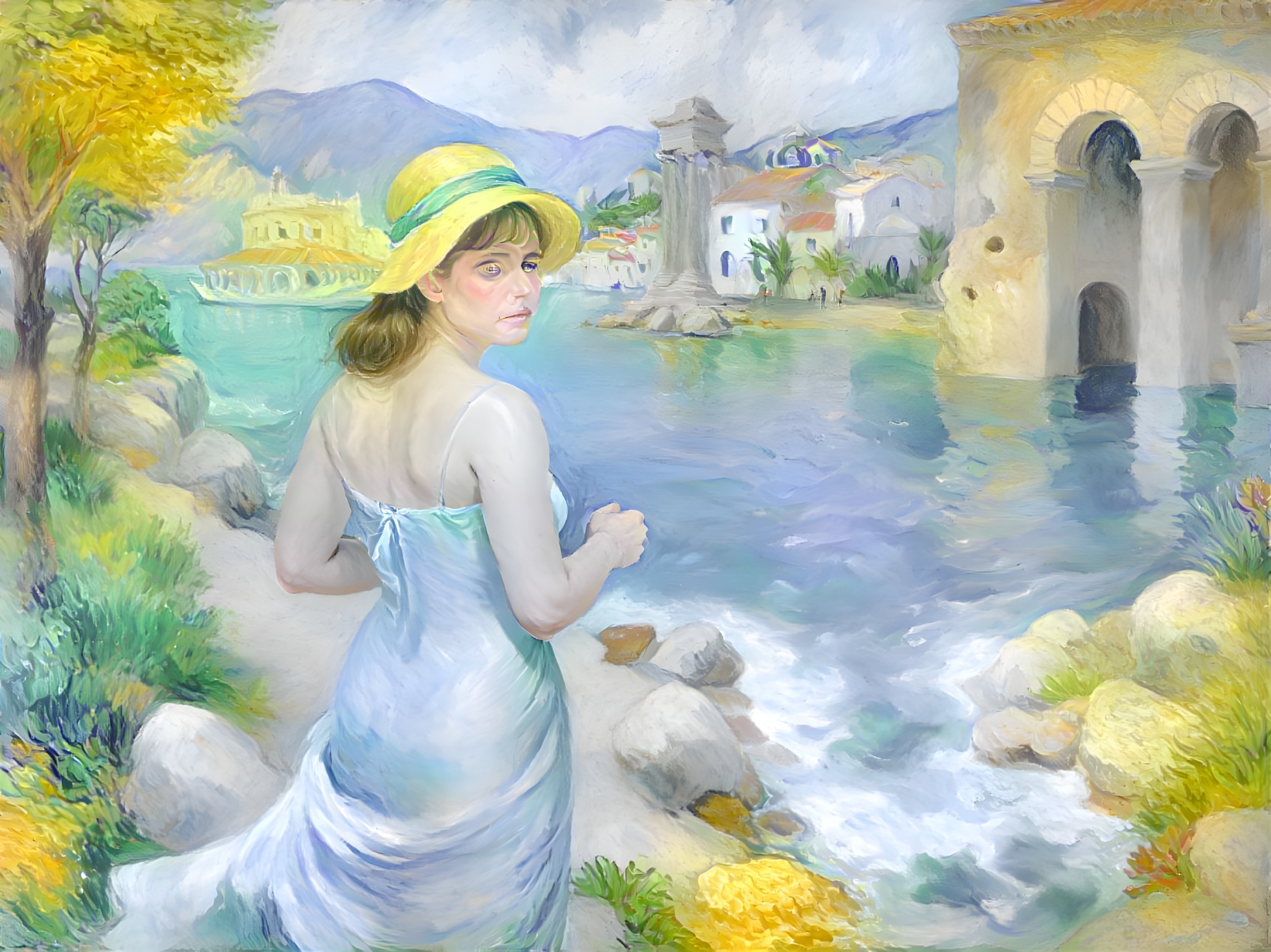 A serene figure in a flowing, pastel dress stands against a vibrant, abstract background of swirling colors. Her hair complements the soft hues, creating an ethereal, dreamlike atmosphere.